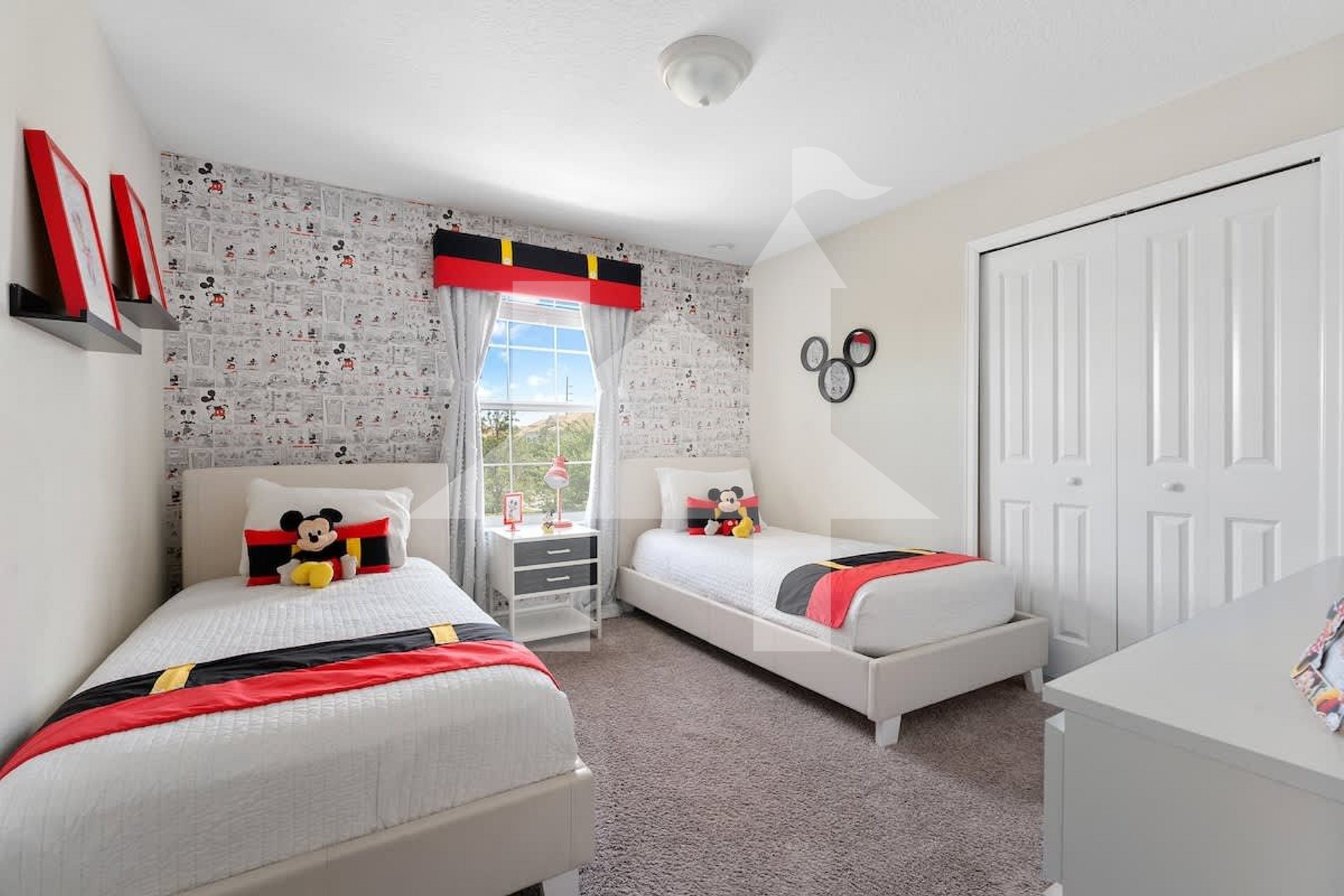 Quarto temático Mickey com duas camas de solteiro e banheiro privativo