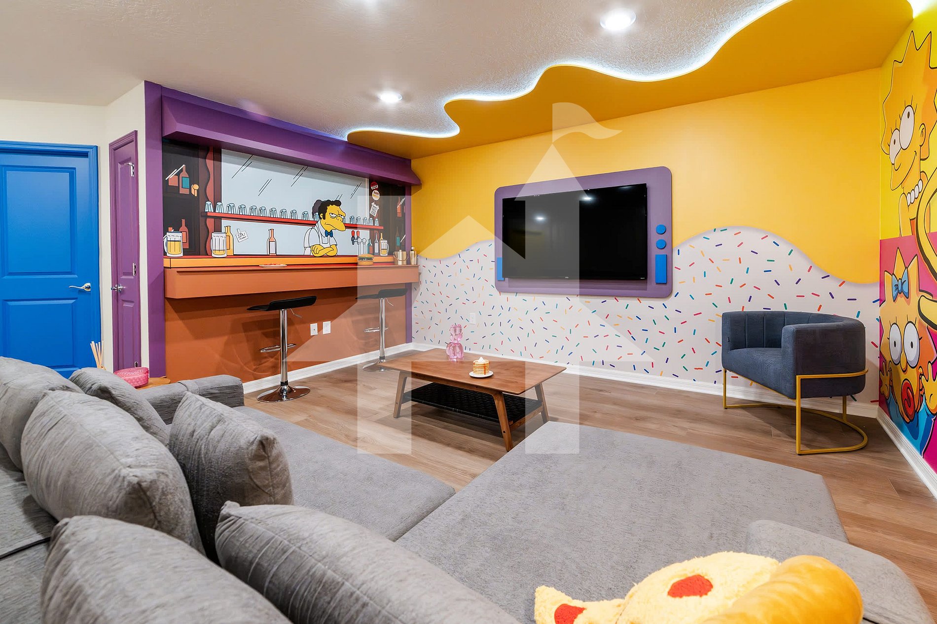 Sala familiar estilo Simpsons para sessões de filme e relaxamento