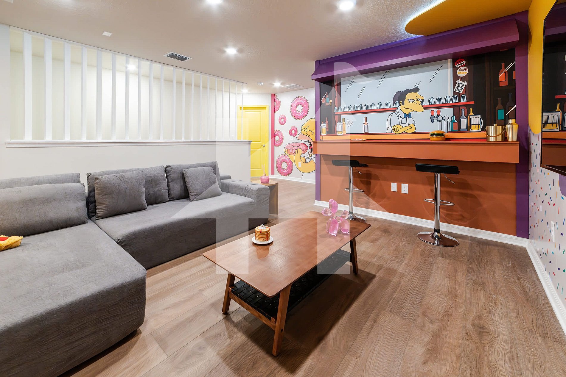 Sala familiar estilo Simpsons para sessões de filme e relaxamento
