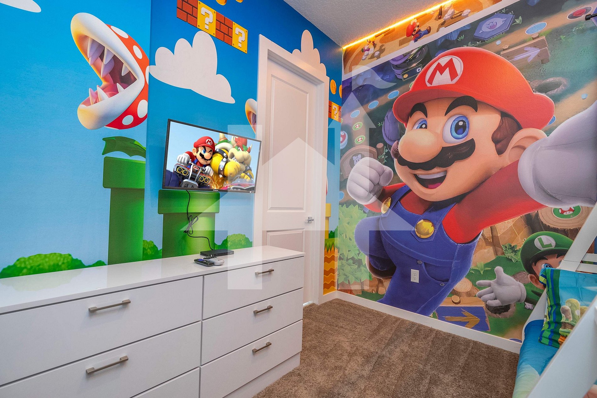 • Quarto temático Mario Bros com beliche (1 cama de casal + 2 camas de solteiro) e banheiro privativo