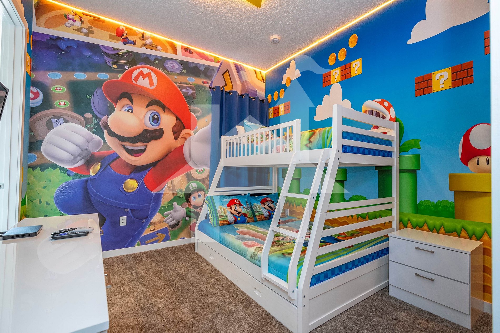 • Quarto temático Mario Bros com beliche (1 cama de casal + 2 camas de solteiro) e banheiro privativo