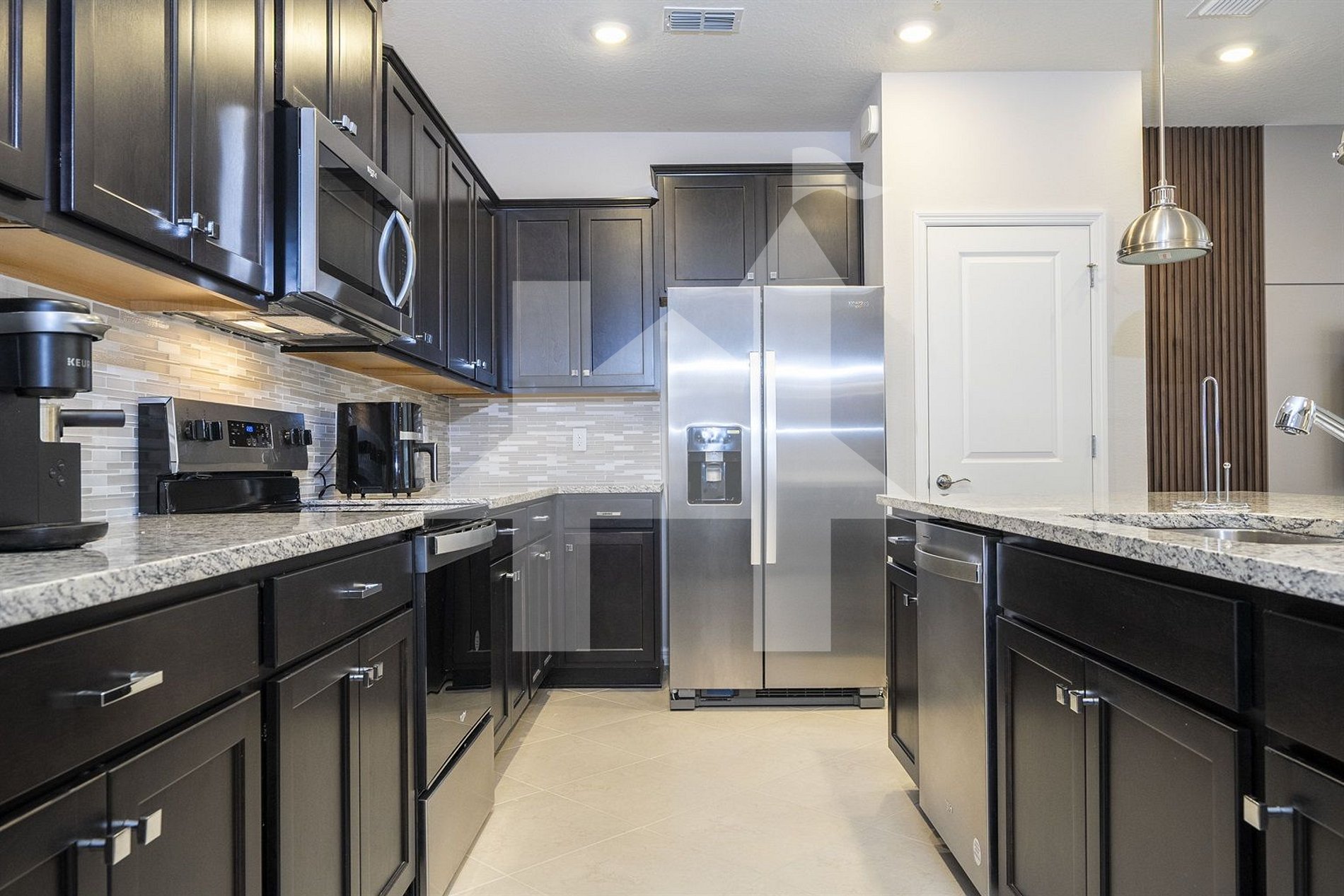 • Cozinha pronta para grupos grandes com eletrodomésticos em inox, cafeteira Keurig + tradicional, air fryer, liquidificador e utensílios completos. A área de estar/jantar é aberta e confortável, com TV grande e espaços que combinam perfeitamente com o que aparece nas fotos — e que os hóspedes frequentemente destacam por estar impecáveis.