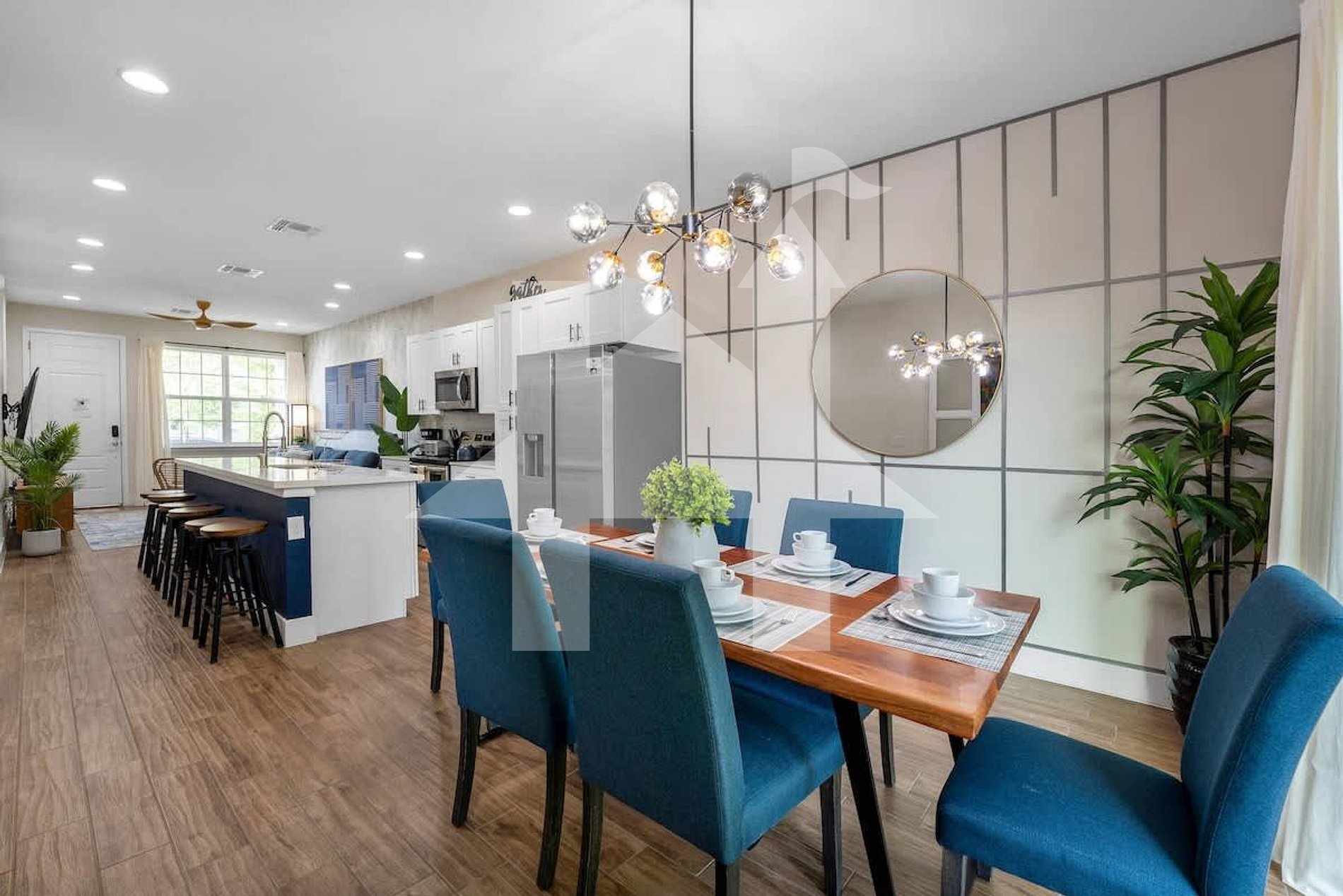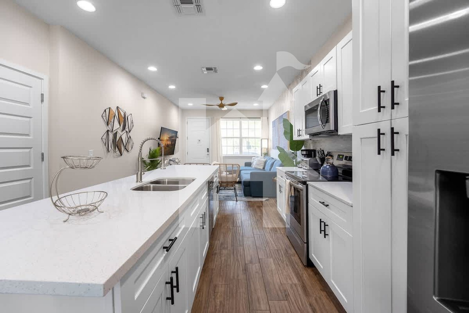 Esta casa geminada de 4 quartos, recém-renovada, reúne design moderno, conforto e detalhes criativos pensados para famílias. Com pisos de madeira, decoração elegante e ambientes bem iluminados, o espaço é ideal para relaxar após dias intensos explorando Orlando, oferecendo excelente custo-benefício sem abrir mão da qualidade.