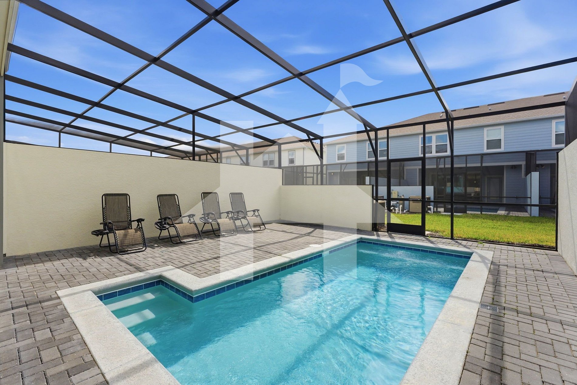 Na área externa, você encontrará um pátio privativo com piscina aquecível, perfeito para aproveitar o clima da Flórida, relaxar ao final do dia ou curtir momentos de lazer com a família.
