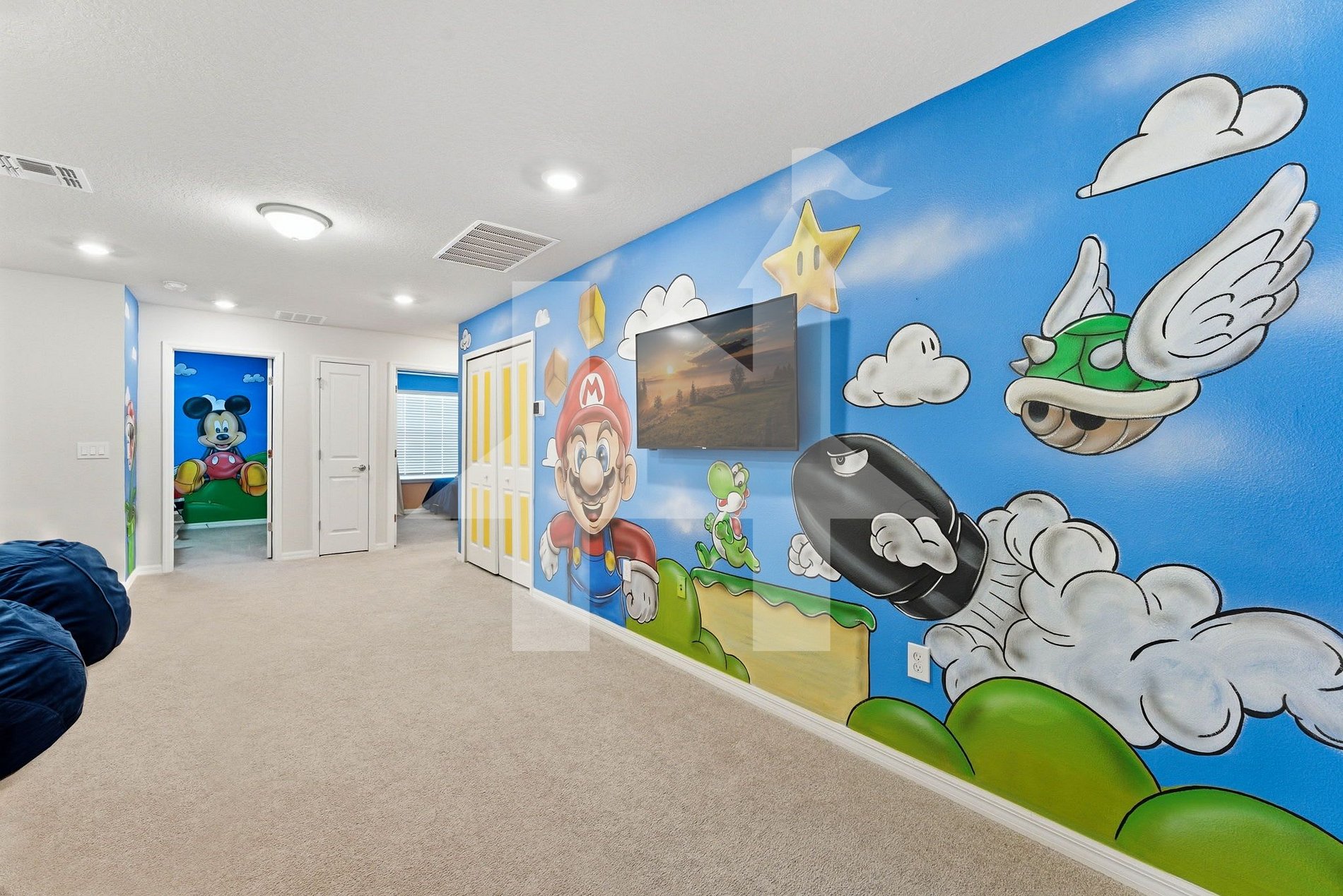 As crianças e fãs de personagens vão adorar os espaços temáticos da casa. O quarto do Mickey Mouse e o quarto inspirado em Toy Story trazem cores vibrantes e detalhes divertidos que tornam a experiência ainda mais especial. A diversão continua na sala de família temática do Mario Bros, um ambiente perfeito para jogos, filmes e momentos de descontração.