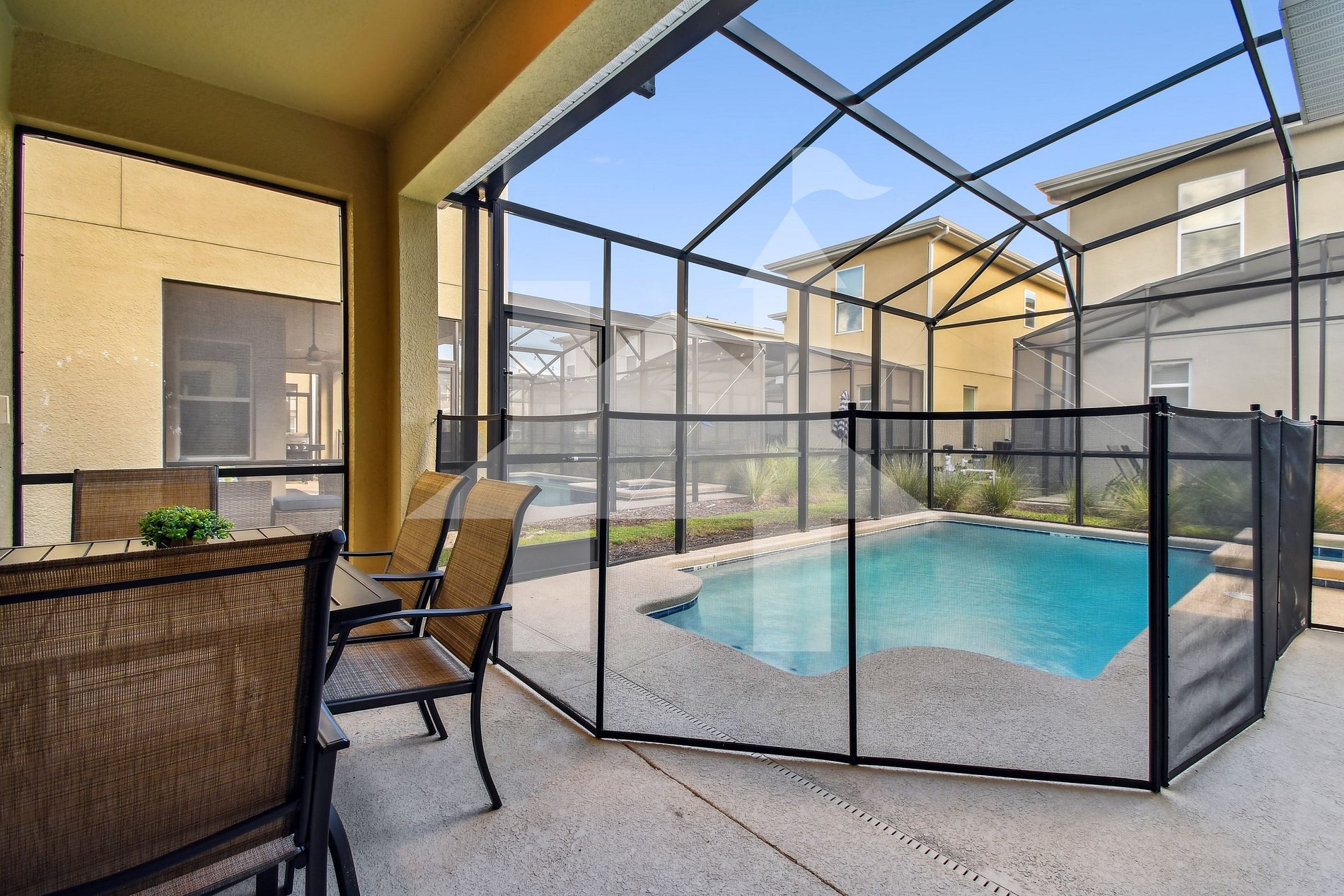 A sala de estar é aberta e espaçosa, com um sofá de 8 lugares e um sofá adicional para relaxar e desfrutar da smart TV de 65 polegadas. Esta área se abre para o lanai totalmente telado e a área da piscina.