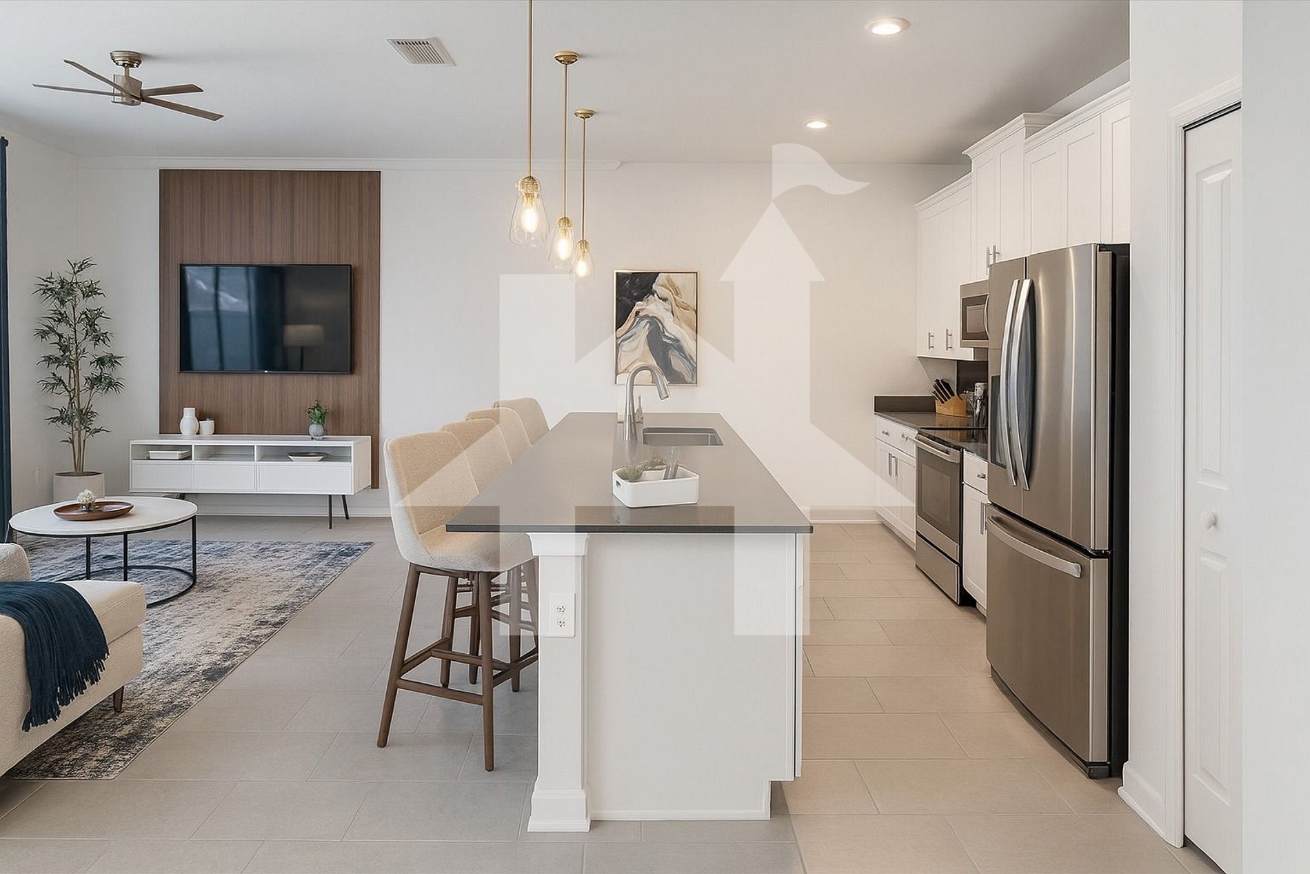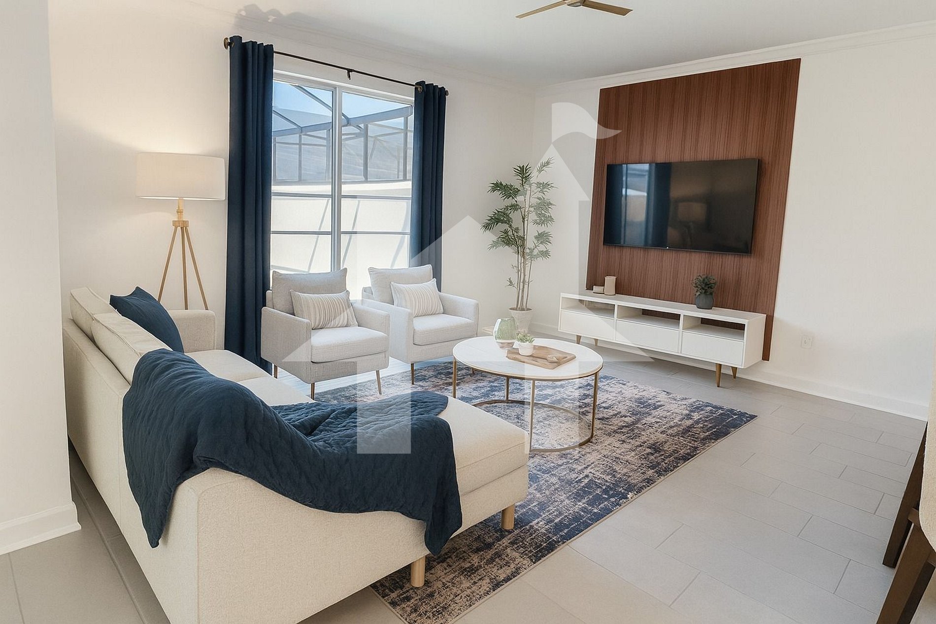 Sala espaçosa: Com um sofá de 5 lugares e 2 cadeiras para relaxar e curtir a TV smart de 65 polegadas. Esta área se abre para a lanai totalmente telada e a área da piscina.