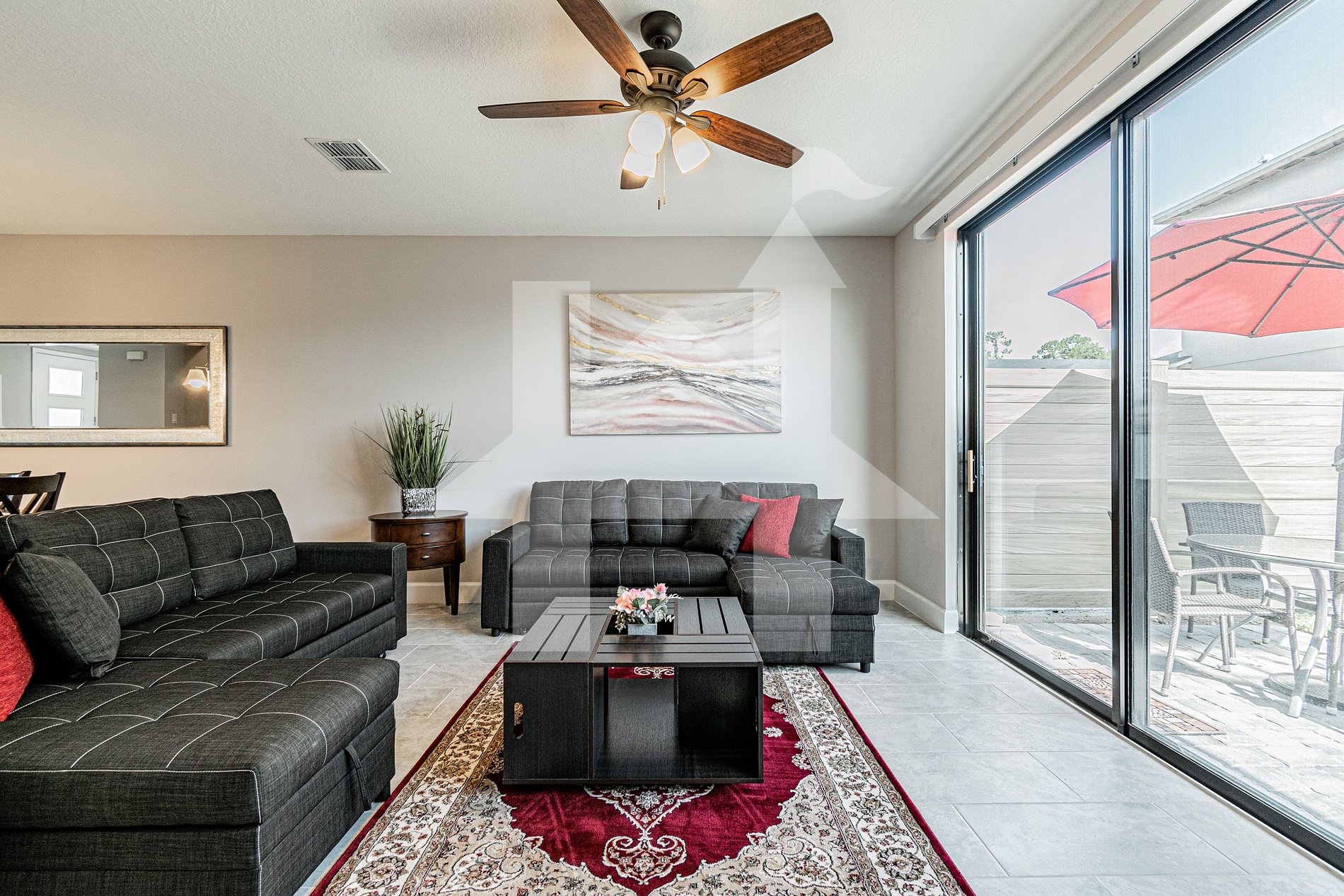 A sala é aberta e espaçosa, com 2 sofás para relaxar e desfrutar da TV Smart ROKU de 65 polegadas. Esta área se abre para a área de churrasco.