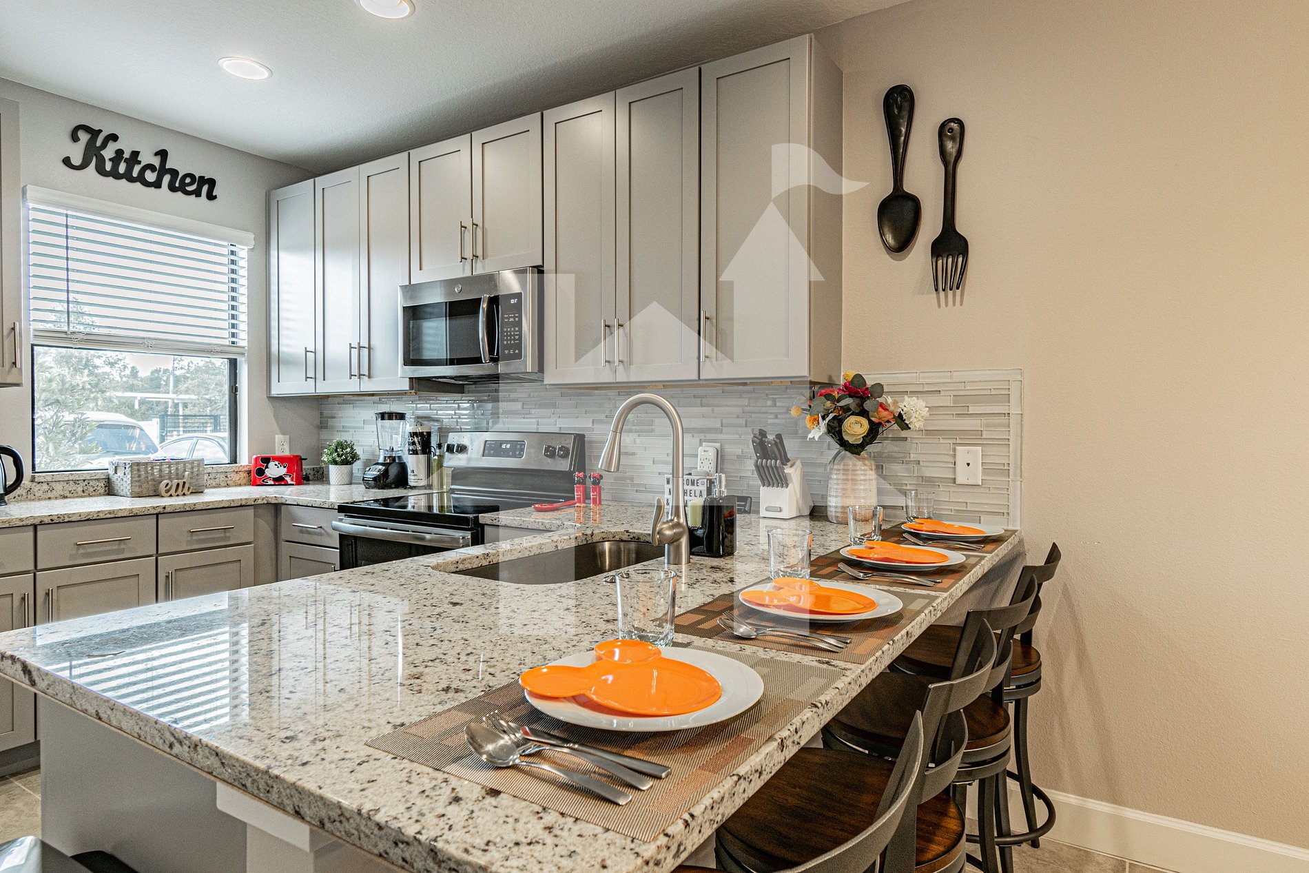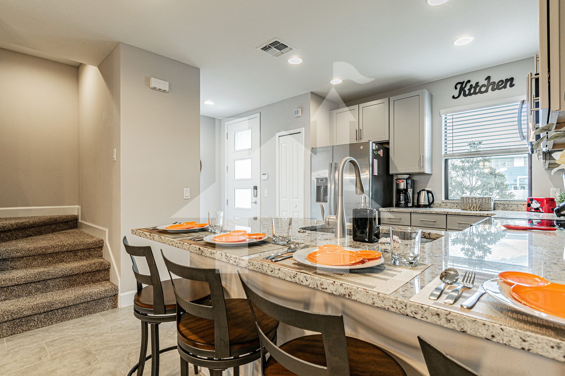 A mesa de jantar acomoda 6 pessoas e mais quatro no balcão de café da manhã. A cozinha totalmente equipada está pronta para você cozinhar para sua família.