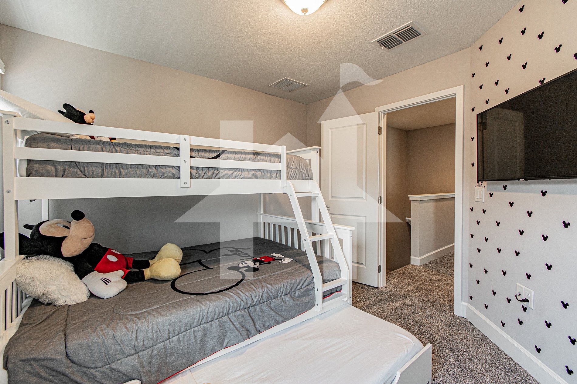 Cama de solteiro sobre cama de casal com cama de solteiro auxiliar, TV Smart ROKU de 50 polegadas.