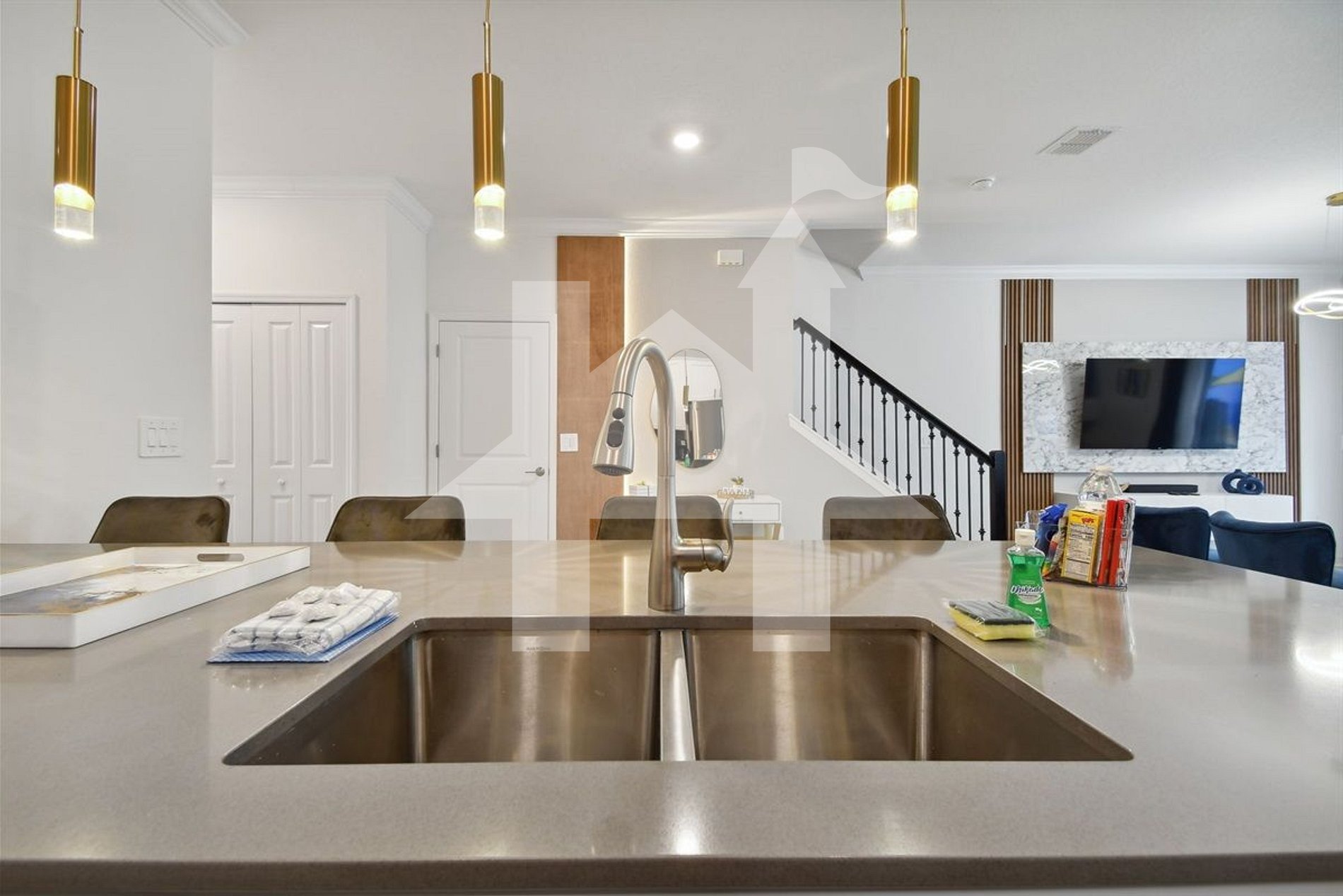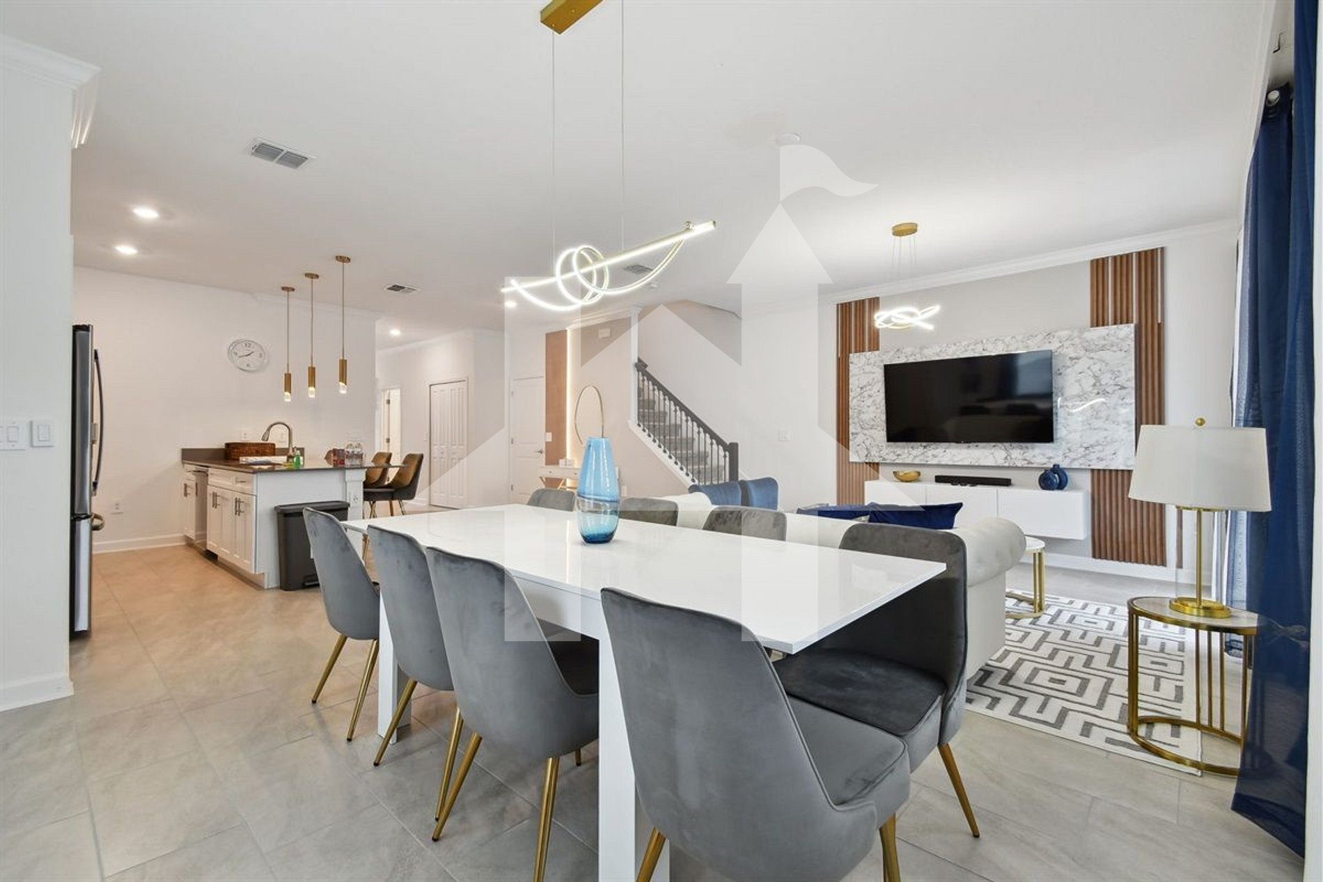 > Ampla e arejada, com um sofá de 6 lugares e um loveseat para relaxar e aproveitar a TV inteligente de 65 polegadas. Esta área se abre para a lanai completamente telada e área da piscina.
