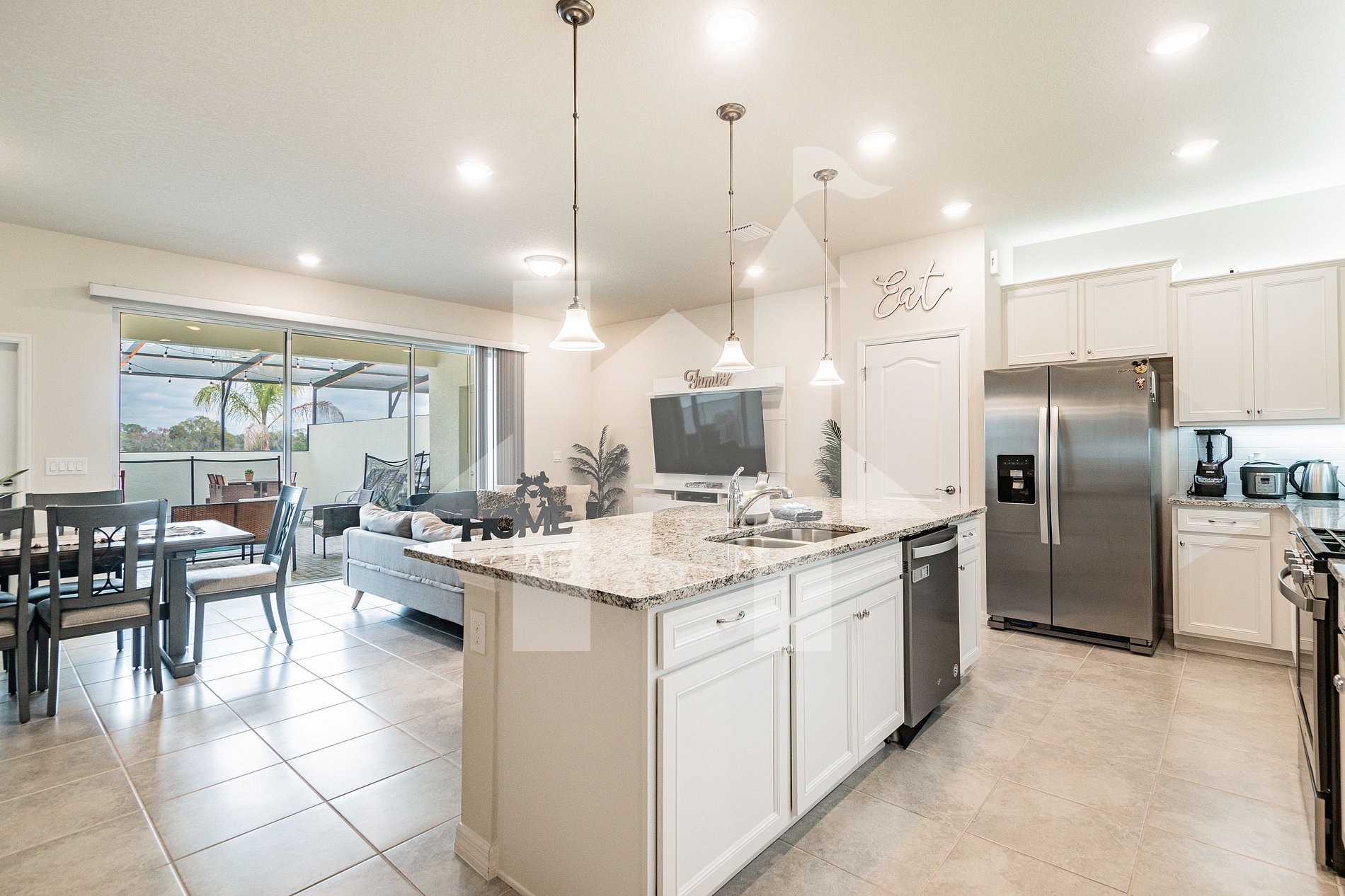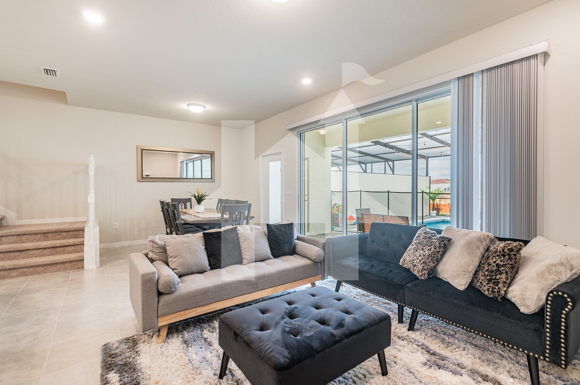 Sala de estar espaçosa: com um sofá de 4 lugares e loveseat para relaxar e desfrutar da TV SMART de 75 polegadas. Esta área se abre para a lanai totalmente protegida e área da piscina com churrasqueira.