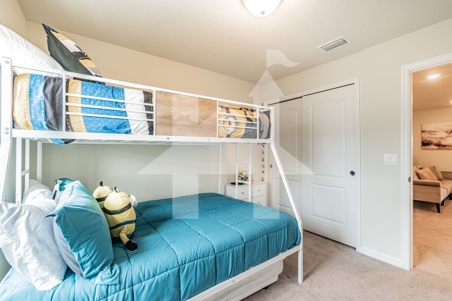 2 Quartos Twin com beliche (Cama de solteiro sobre cama de casal com cama pull-out de solteiro) cada um (acomoda 4 pessoas), TV SMART de 55 polegadas, compartilhando um banheiro completo