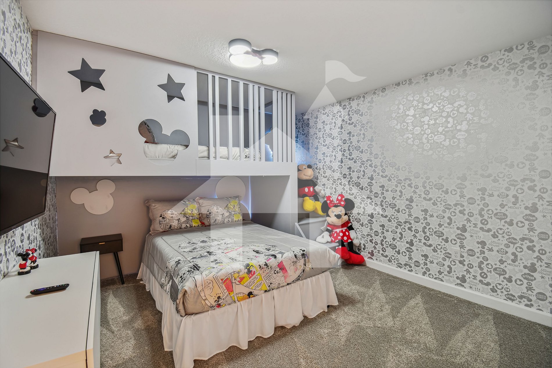 >Quarto Mickey - 1 cama de casal e 1 cama de solteiro, TV SMART de 40 polegadas compartilhando banheiro completo
