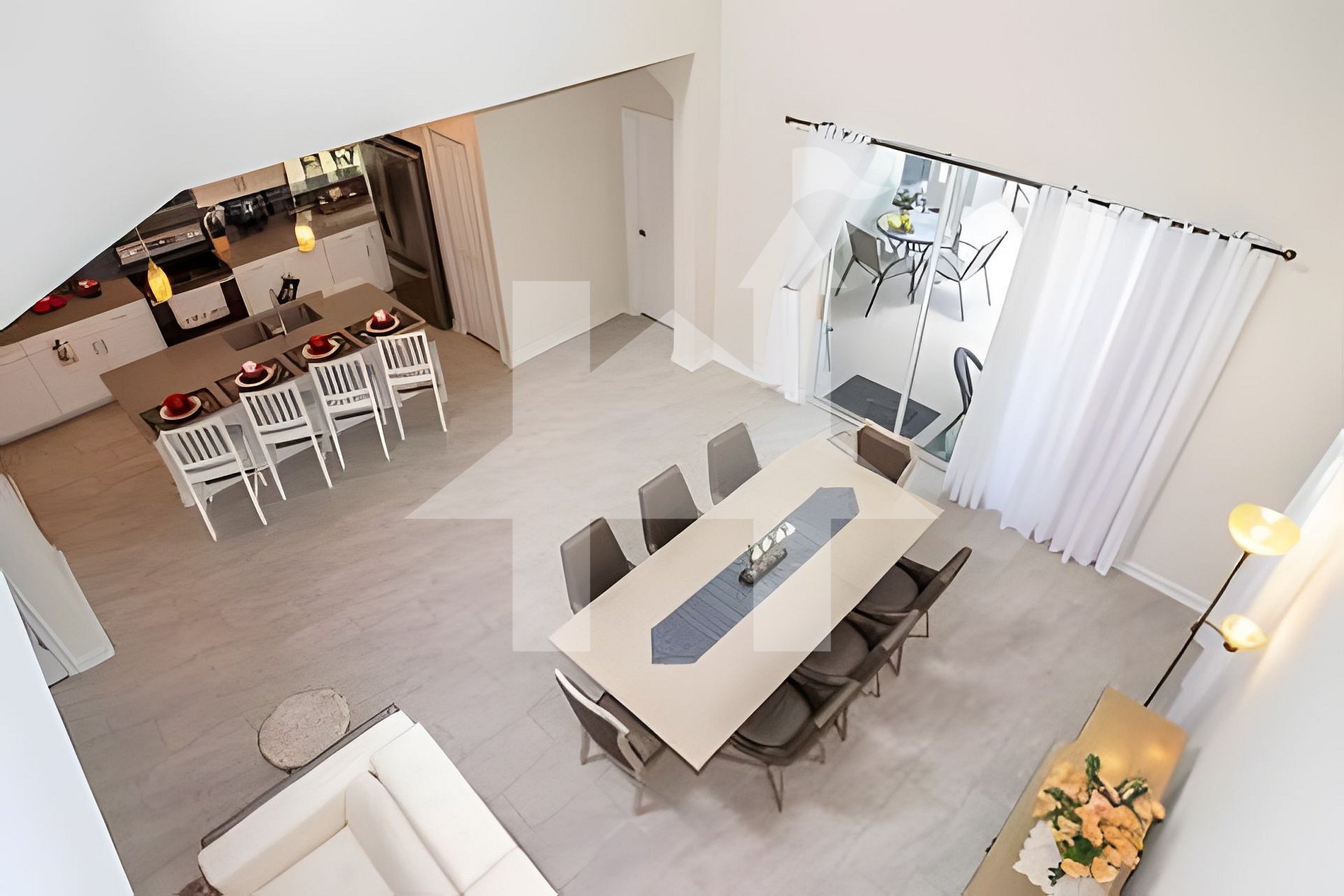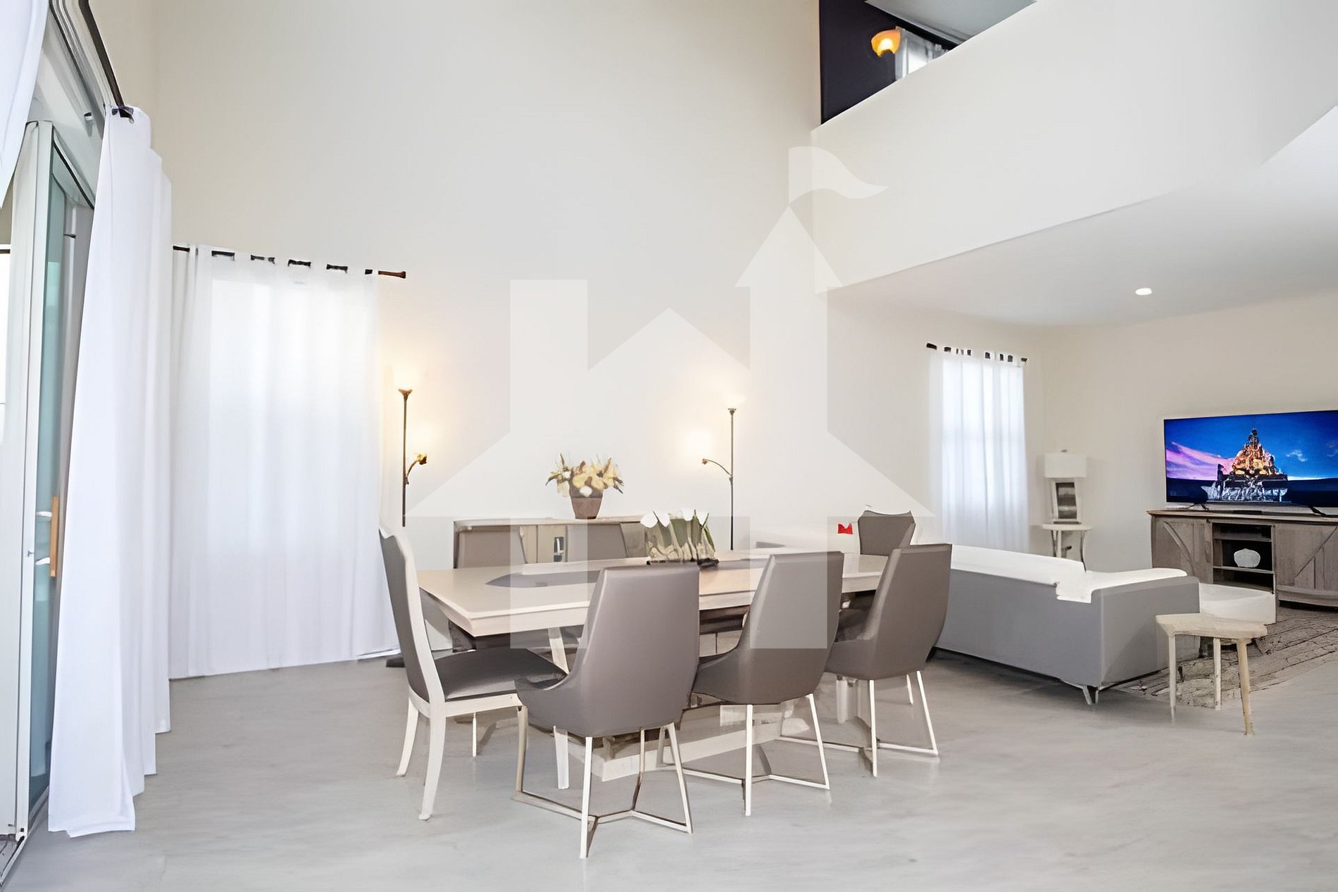 Áreas de Estar e Jantar Sala de estar com TV Smart 65”, sofá para 8 e loveseat. Sala de jantar para 8 + balcão com 4 banquetas. Cozinha moderna totalmente equipada.
