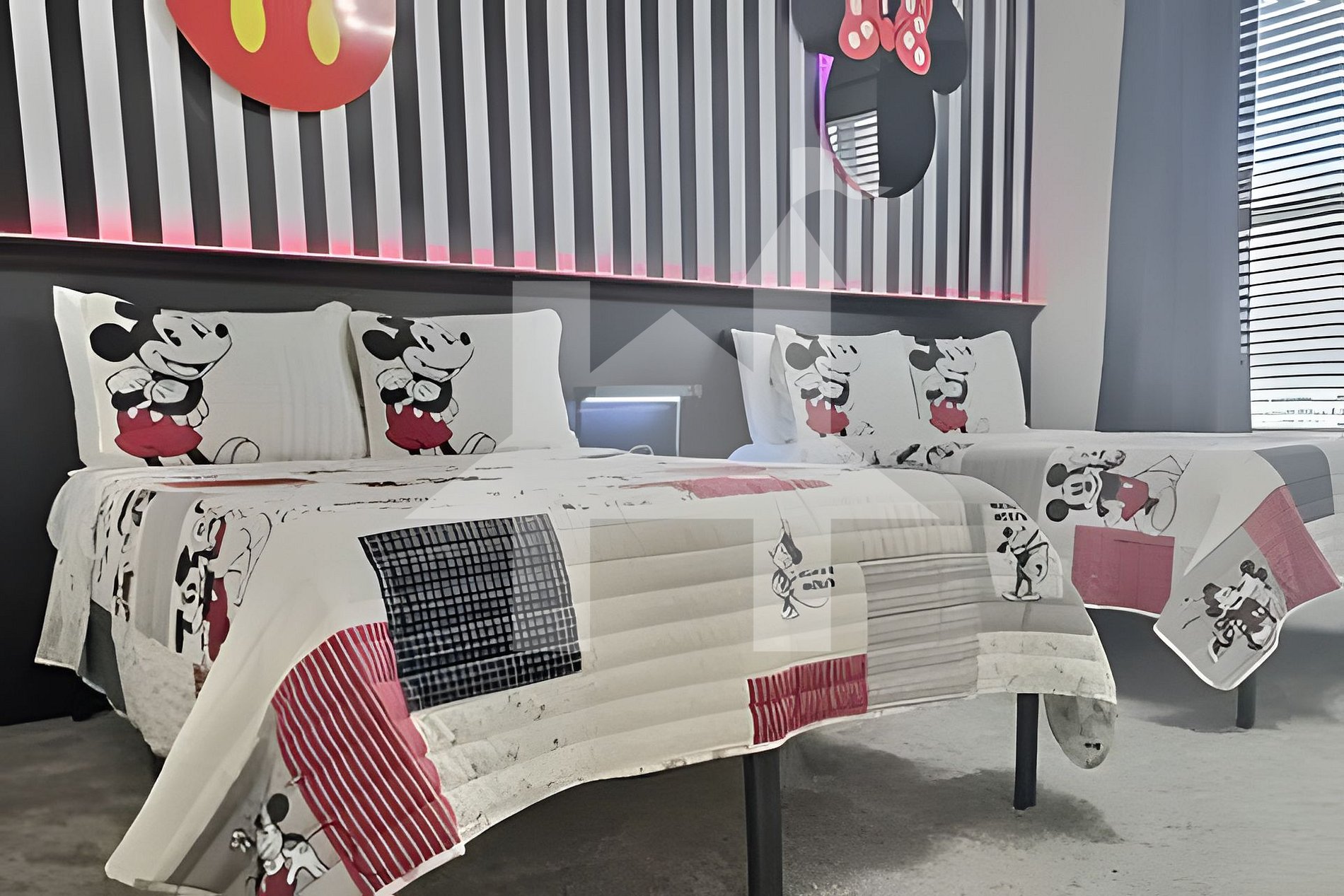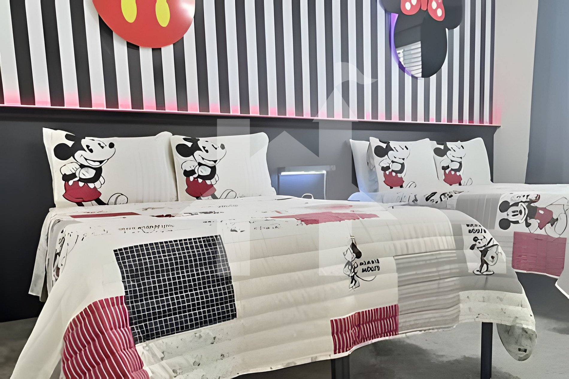 Quarto Mickey & Minnie: 2 camas full, Smart TV, banheiro compartilhado. Quarto Mario Bros: beliche solteiro, Smart TV, banheiro compartilhado.