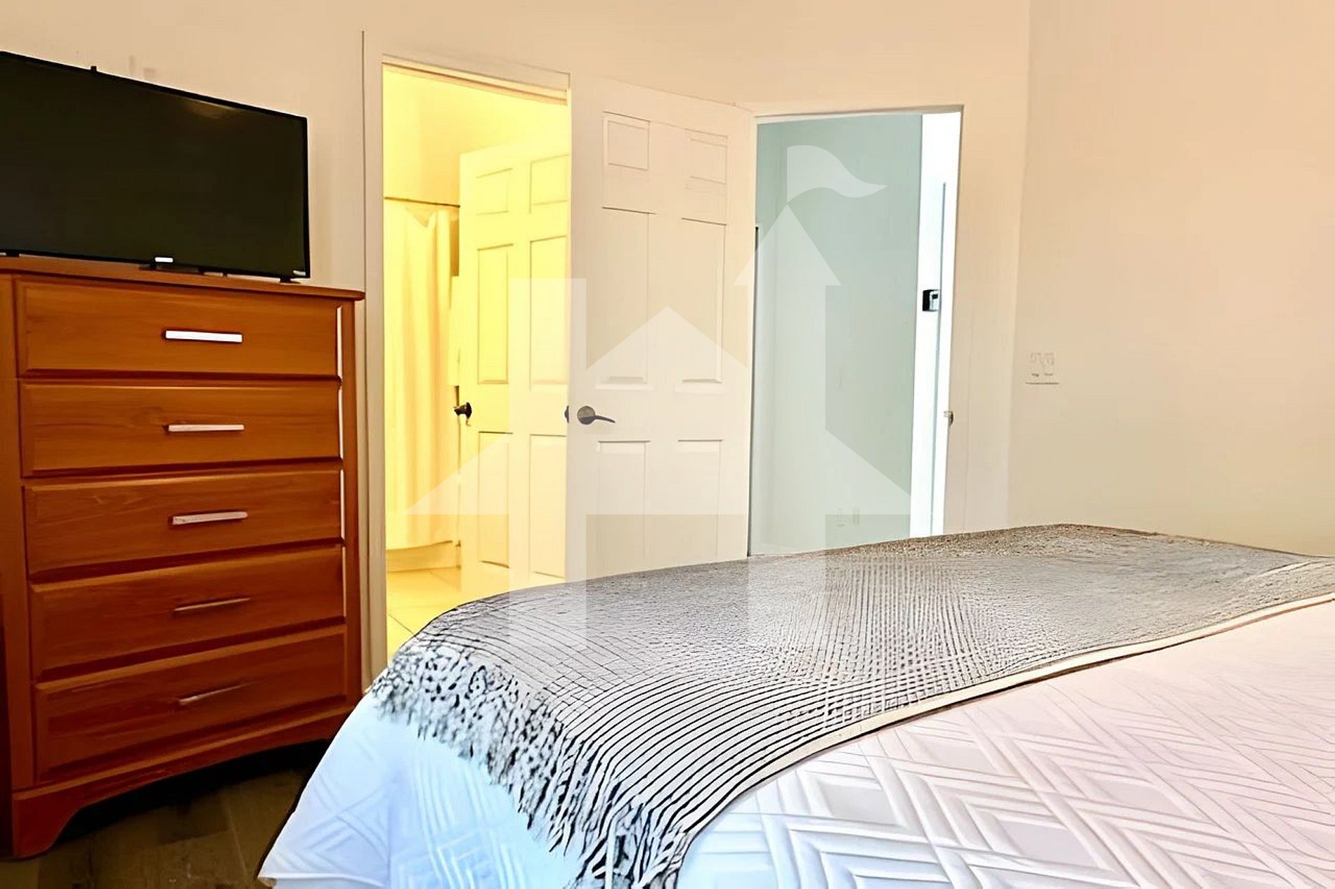 Quarto 4 (Suíte Master Piso Superior): Cama King, banheiro privativo com chuveiro, TV Roku, ventilador de teto (acomoda 2)