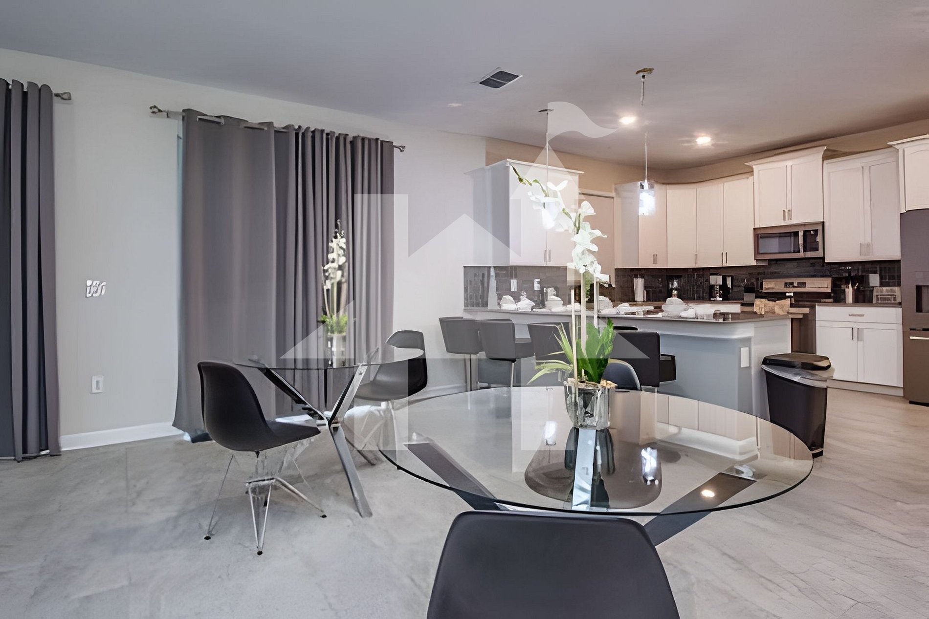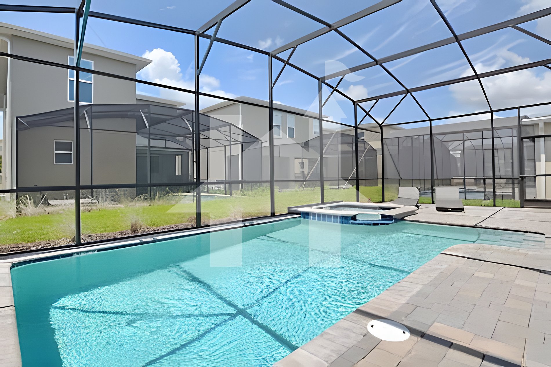 Na área externa, você terá uma piscina privativa com spa, deck telado e espaço para refeições ao ar livre — perfeito para relaxar no sol da Flórida. A casa também conta com ambientes integrados, cozinha totalmente equipada e banheiros privativos que garantem conforto e praticidade.