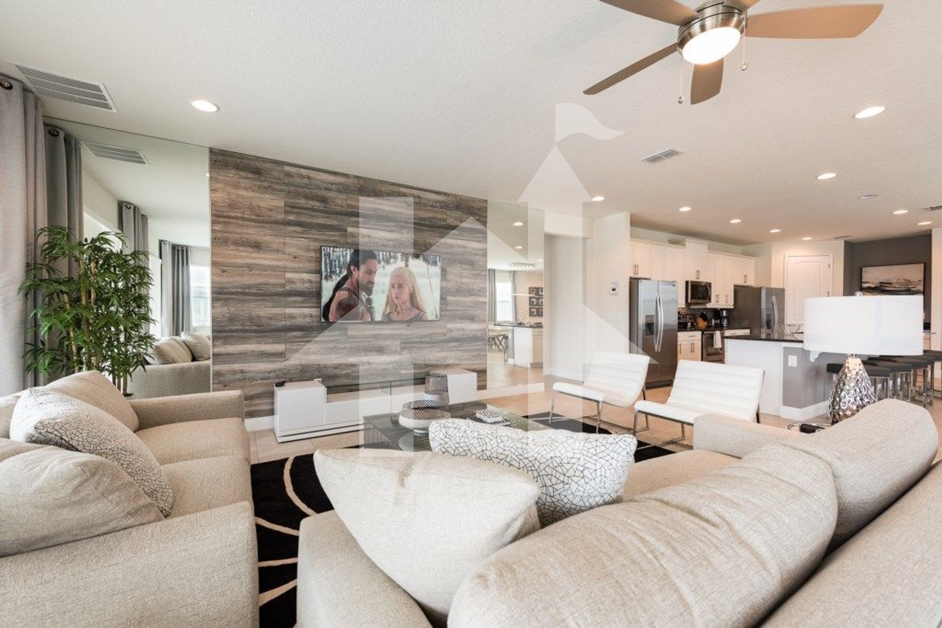 Cozinha completa com 2 geladeiras, sala ampla e quartos com Smart TV. Ideal para famílias e grupos que buscam conforto, espaço e diversão em Orlando.