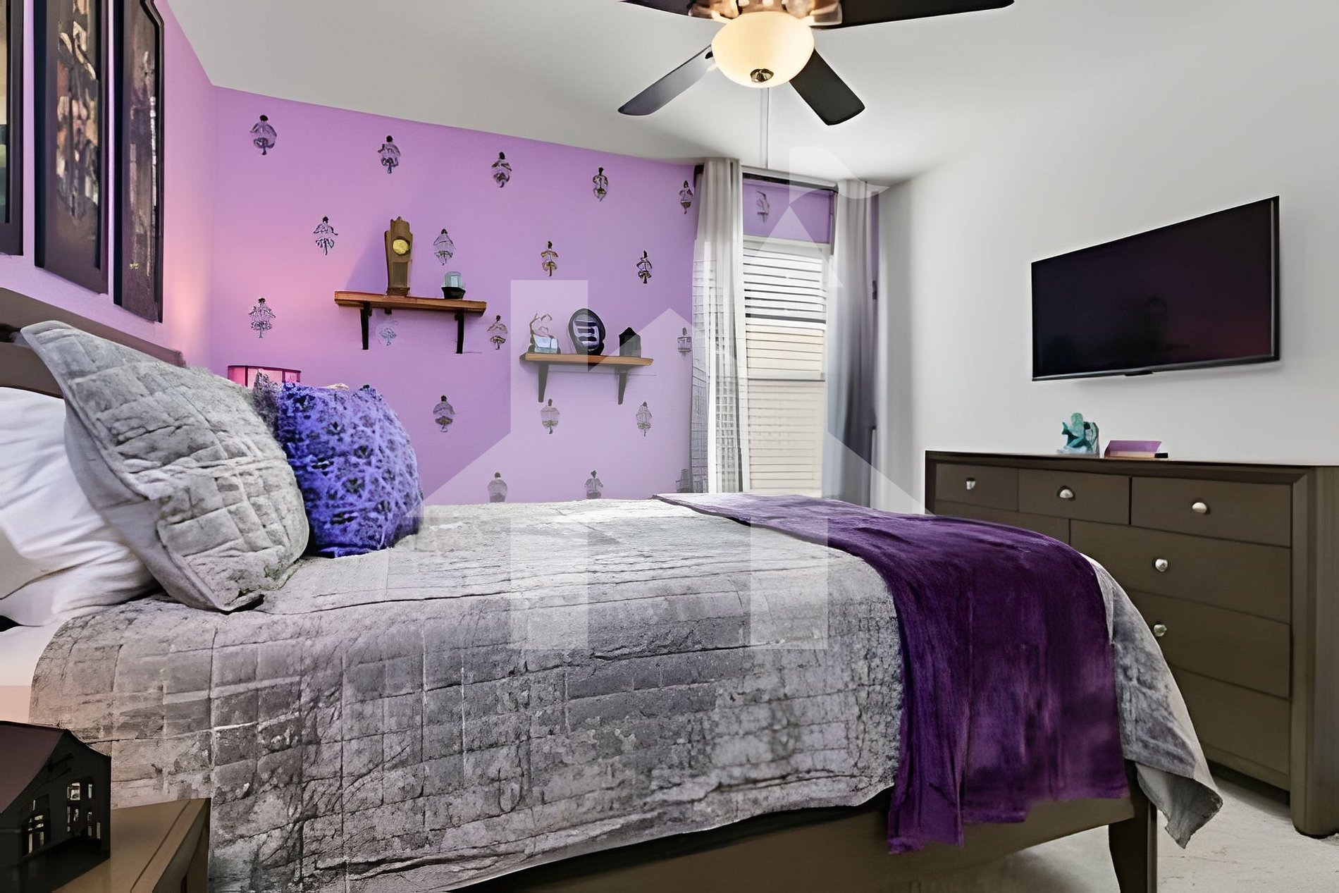 Quarto 3: 1 cama Queen com tema Follish Mortals (banheiro compartilhado).