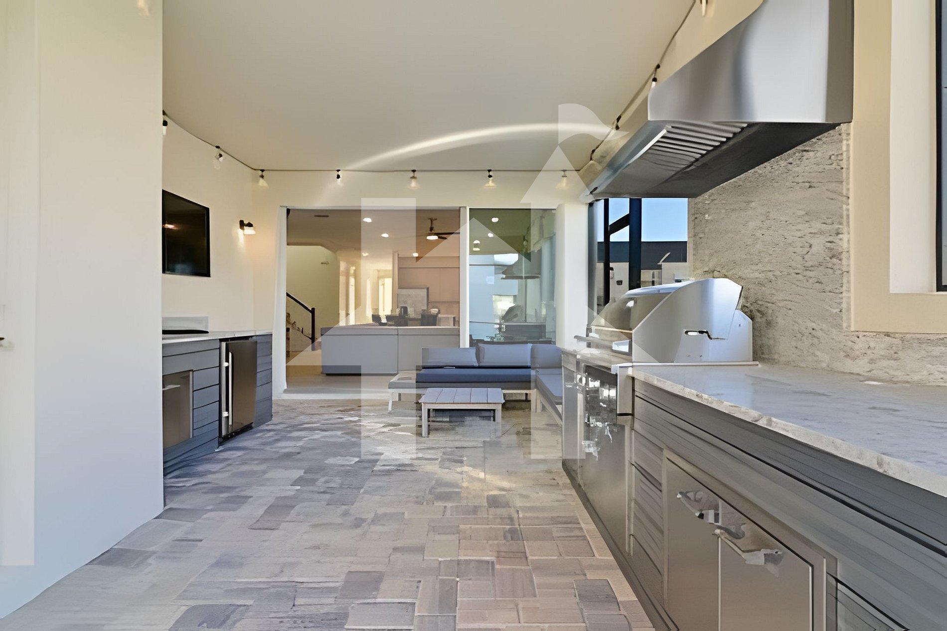 Área de churrasco ao ar livre com móveis de pátio