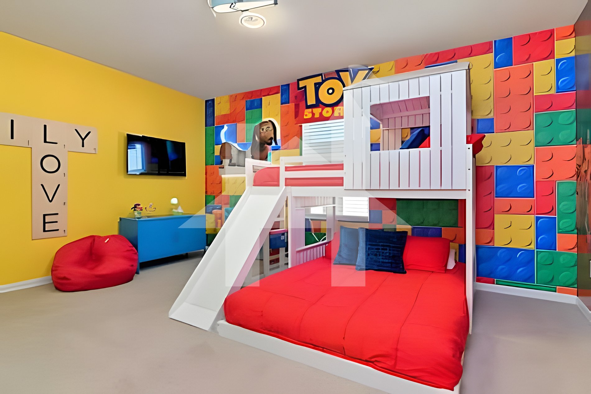 Quarto 5: 1 cama de solteiro + 1 beliche cheia com tema Toy Story (banheiro Jack e Jill).