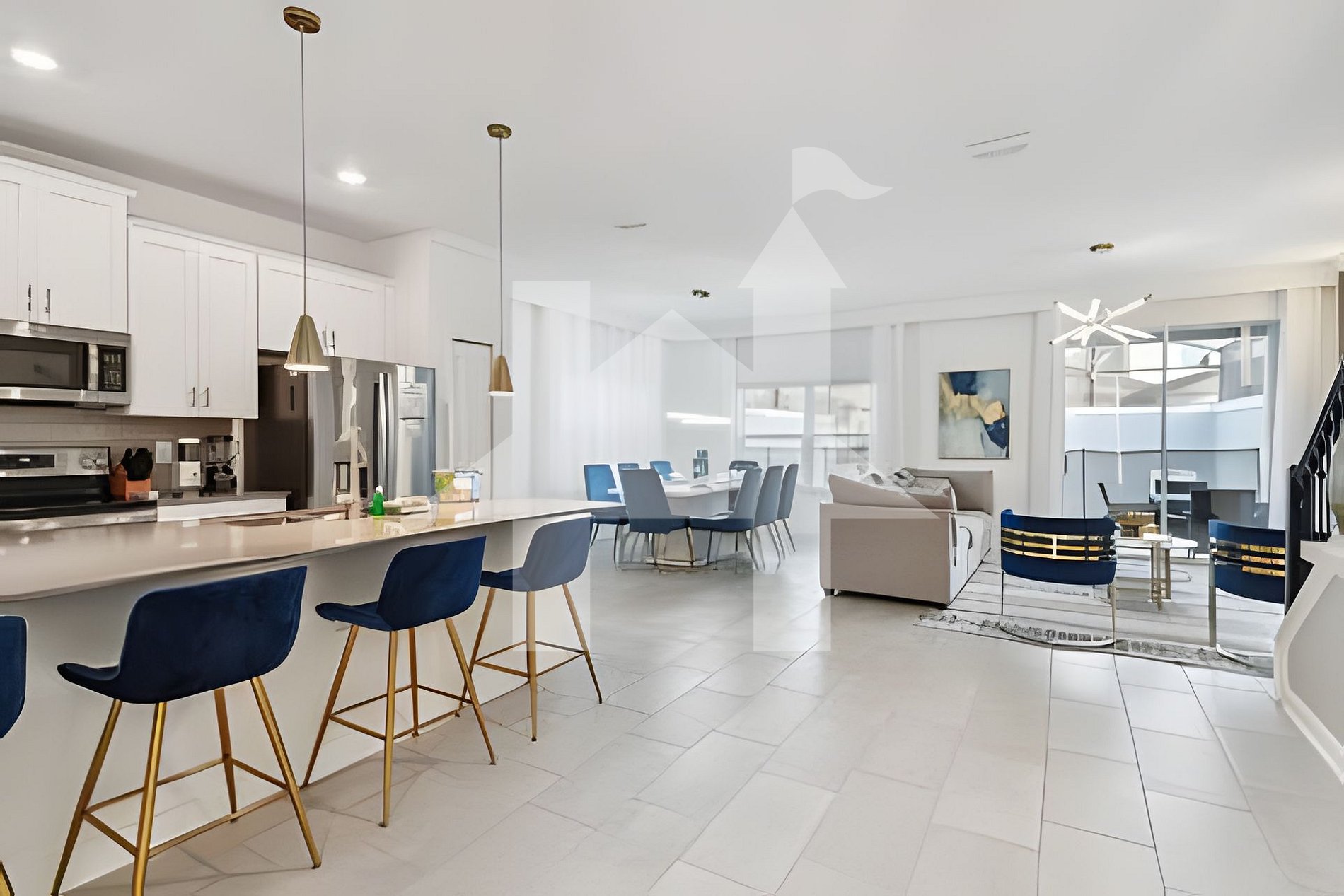 Detalhes do Imóvel Desfrute de conforto e sofisticação neste townhome de 5 quartos e 4 banheiros em Storey Lake—ideal para famílias ou grupos grandes (até 12 pessoas). A sala de estar ampla com sofá para 5 e TV de 65″ é um convite ao descanso. Conecta-se à cozinha funcional, mesa de jantar para 8 e bar americano com mais 4 assentos.