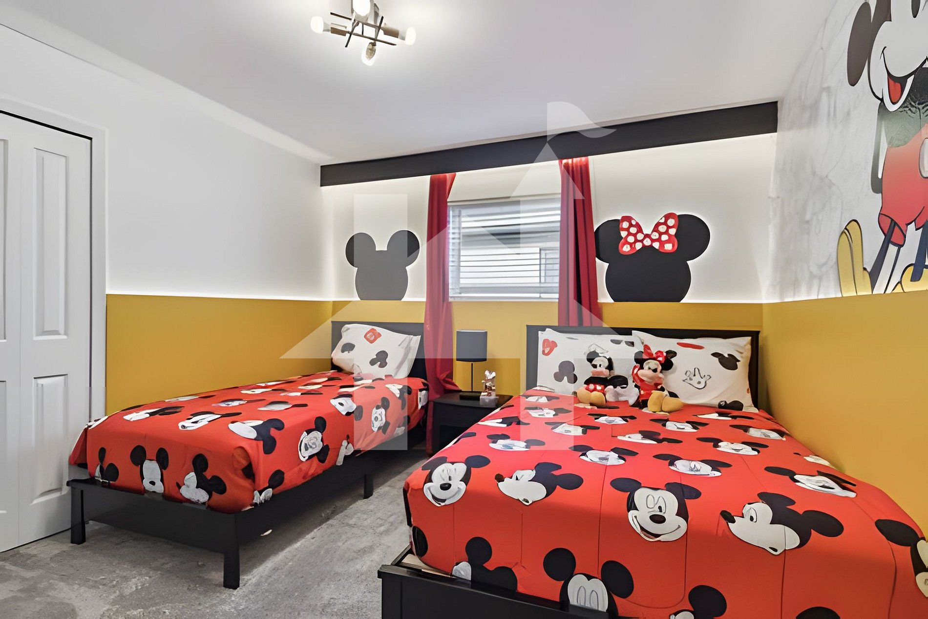 Quarto temático Mickey: cama de solteiro + cama de casal, TV, compartilhando banheiro