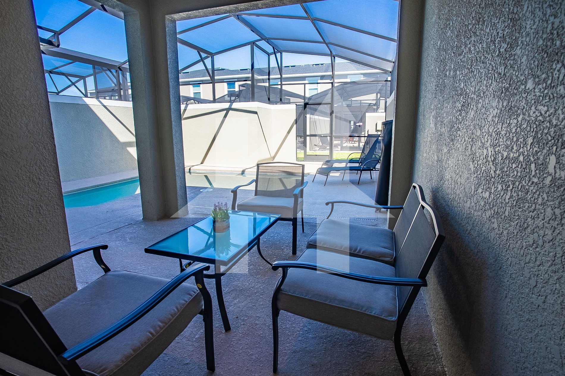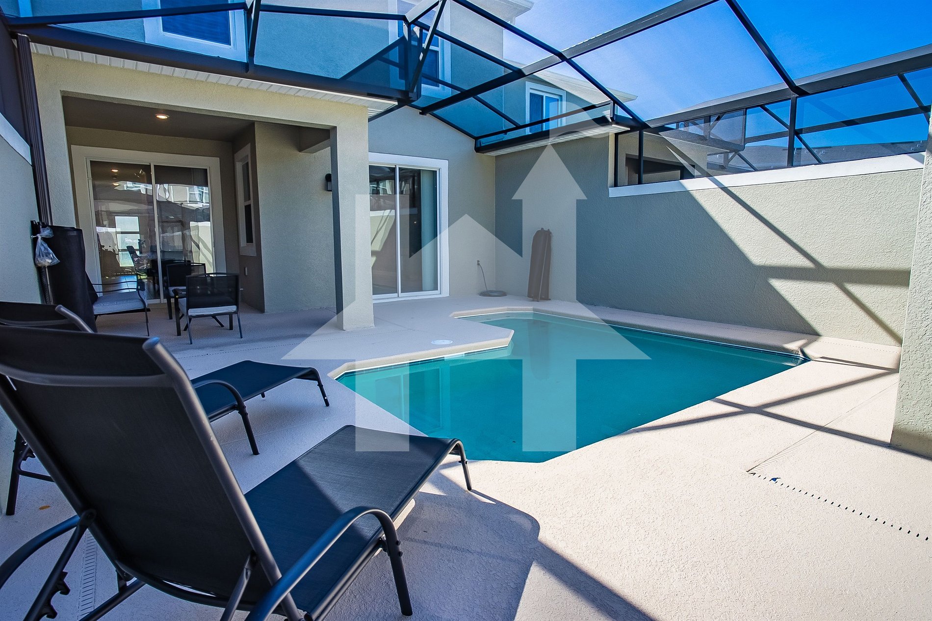 Relaxe na área externa com piscina aquecida privada, perfeita para momentos em família após um dia nos parques. Wi-Fi gratuito e rápido (200MB) disponível.