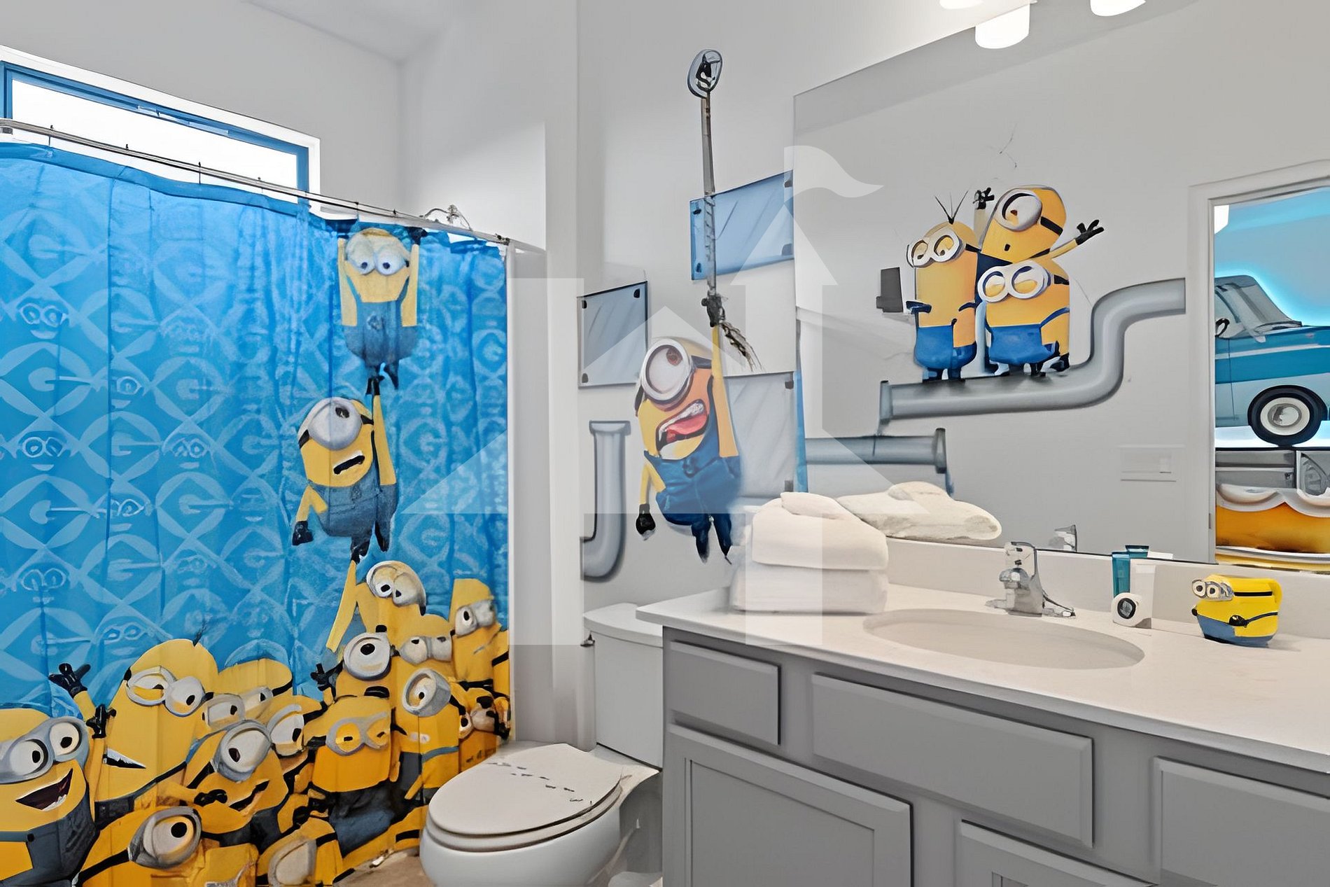 O interior conta com amplas áreas integradas de estar e jantar, cozinha completa com eletros modernos e quartos temáticos inspirados em Minions, Toy Story, Super Mario e Encanto, além de um incrível cinema Harry Potter com TV de 85” e poltronas reclináveis.