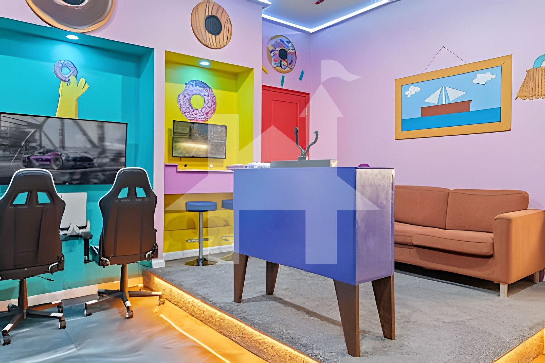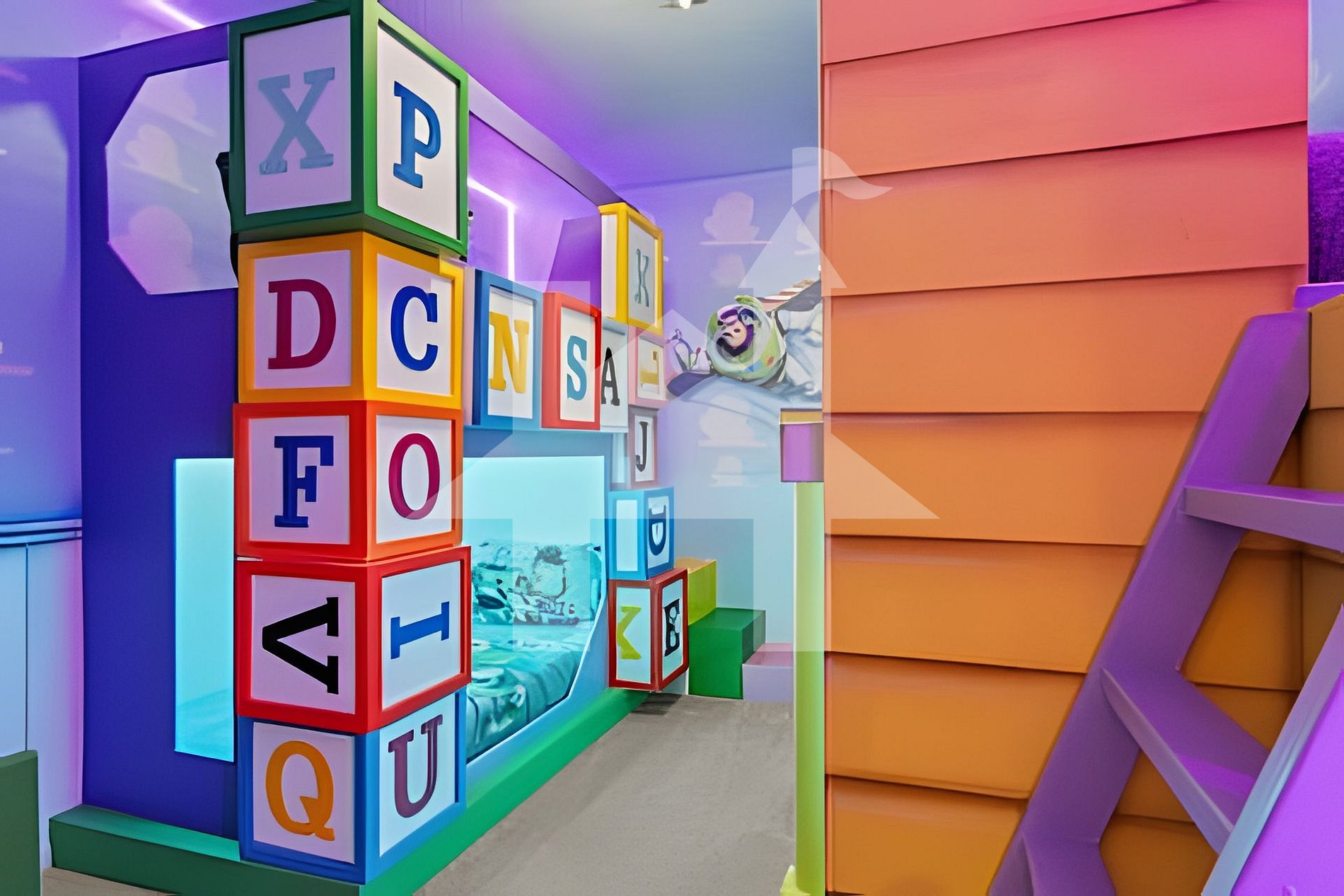 O interior conta com amplas áreas integradas de estar e jantar, cozinha completa com eletros modernos e quartos temáticos inspirados em Minions, Toy Story, Super Mario e Encanto, além de um incrível cinema Harry Potter com TV de 85” e poltronas reclináveis.