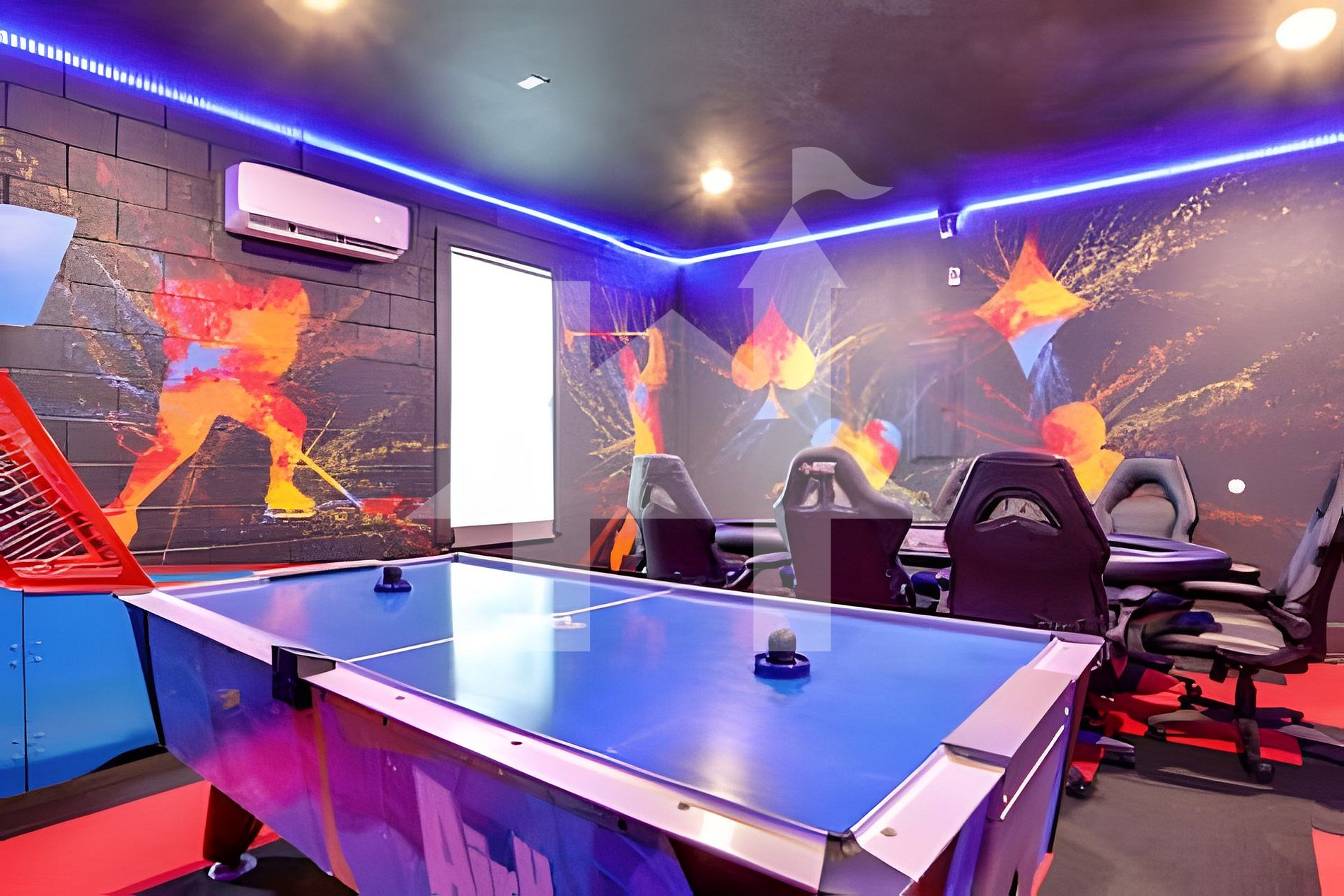 A sala de jogos climatizada reúne tudo: Air Hockey, Skee-Ball, basquete eletrônico, sinuca, pôquer, blackjack, cadeiras de massagem e TV 82”. No andar superior, o loft mantém a diversão com simuladores de corrida e fliperamas.