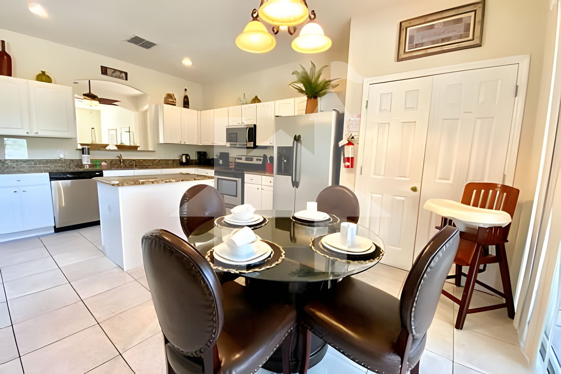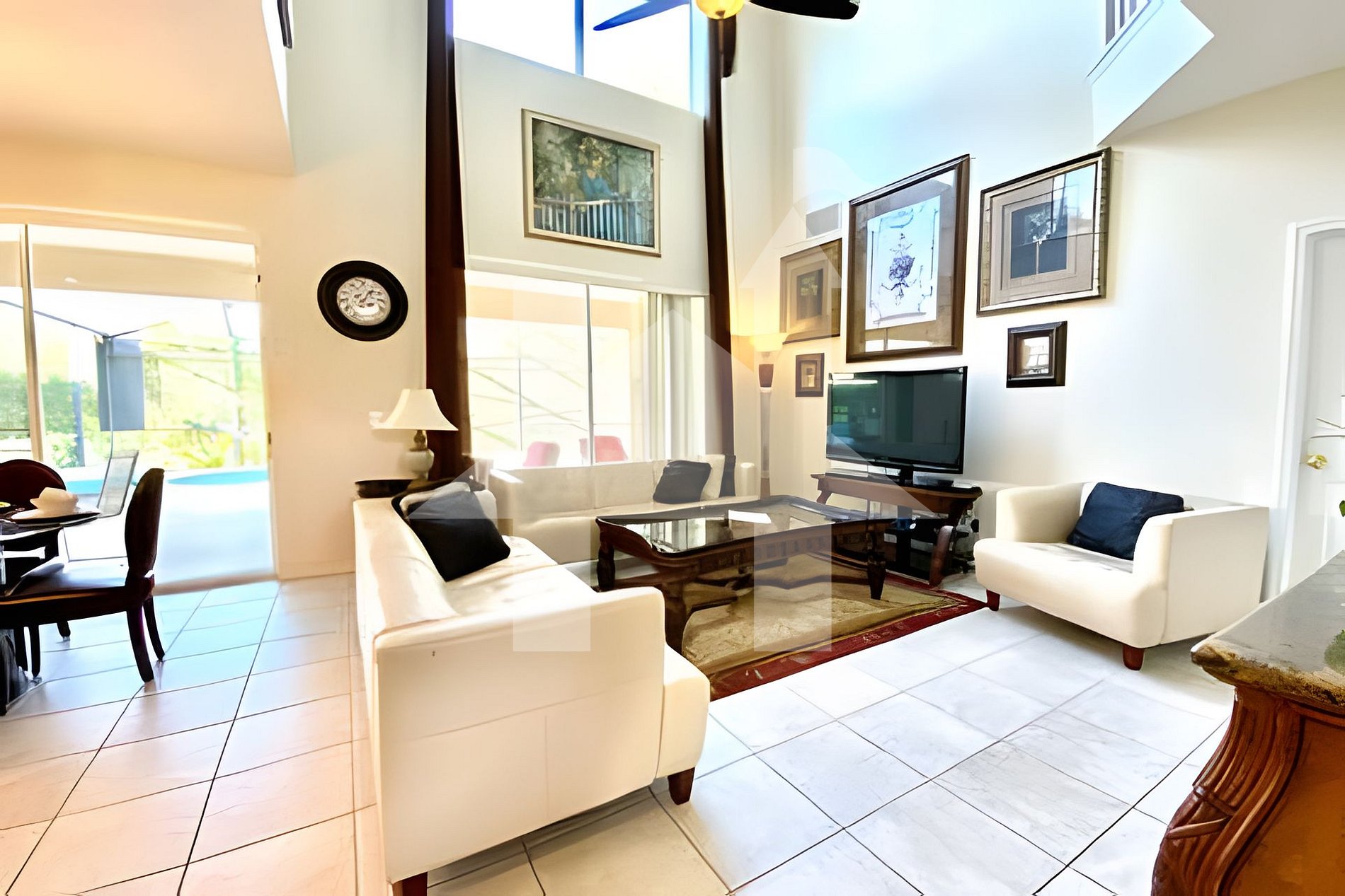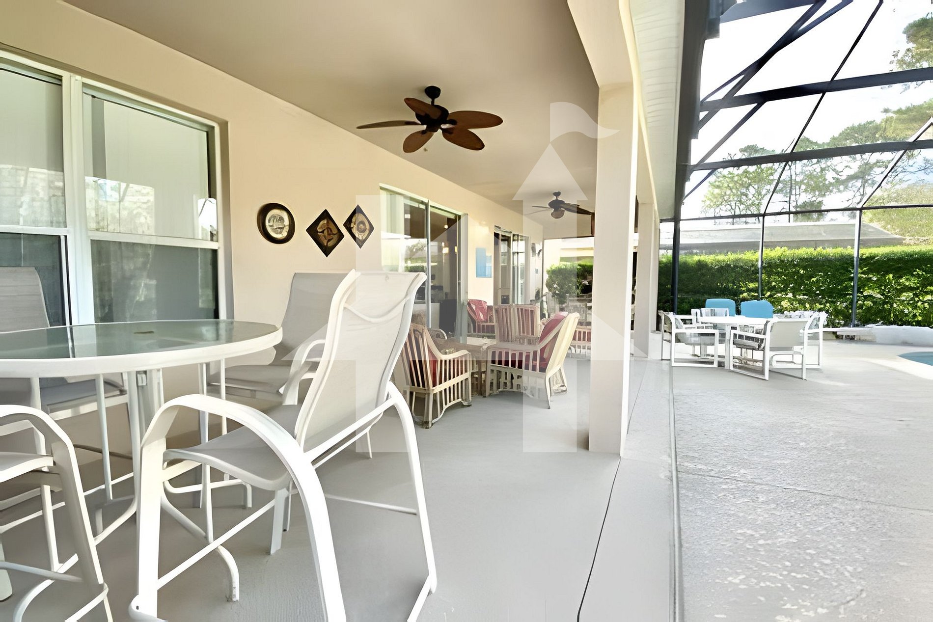 A área externa conta com uma varanda coberta e duas mesas de jantar ao ar livre, ideais para desfrutar o clima ensolarado da Flórida.