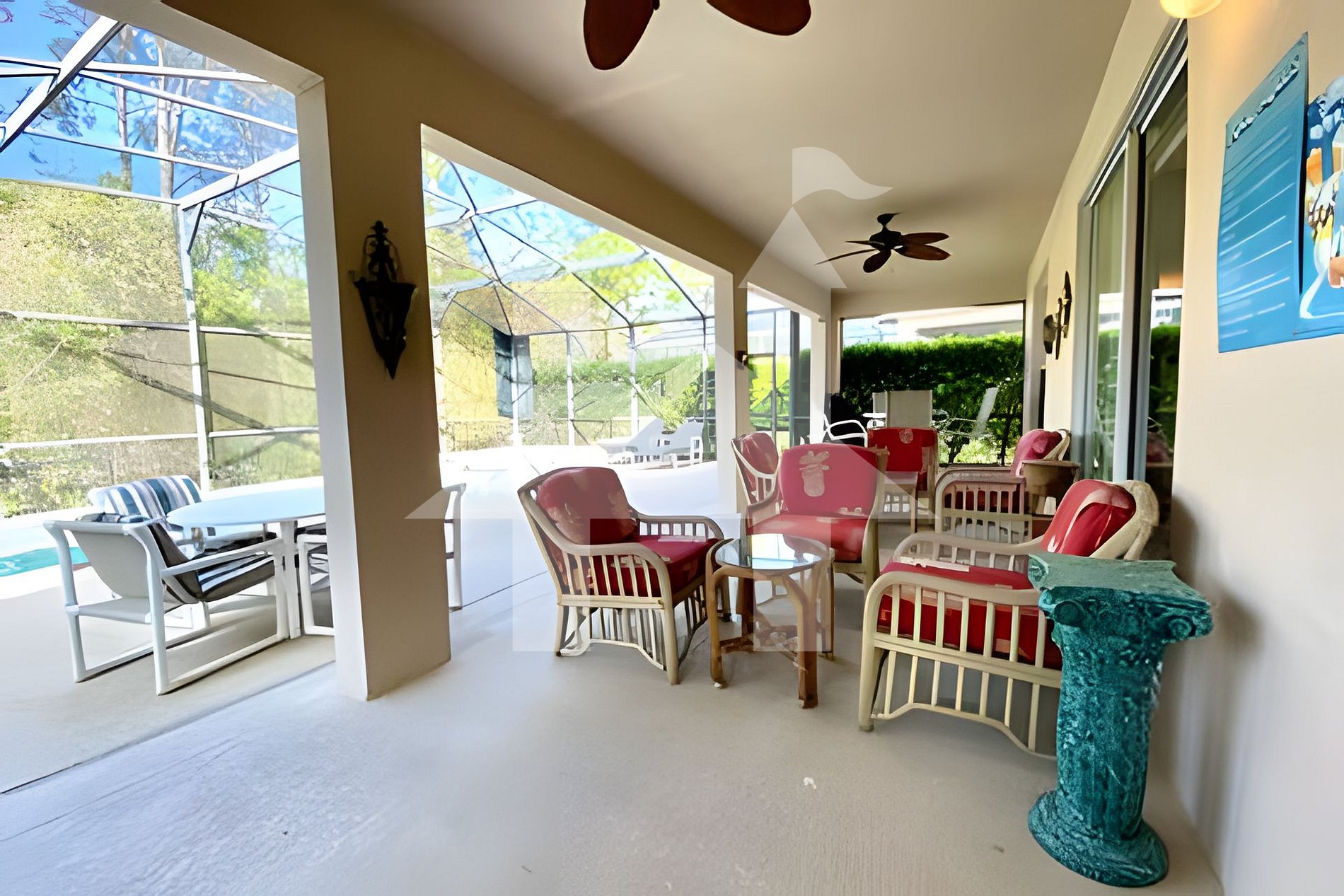 A área externa conta com uma varanda coberta e duas mesas de jantar ao ar livre, ideais para desfrutar o clima ensolarado da Flórida.