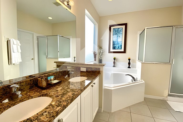 Luxuosa Villa 6 Quartos com Piscina Privada, Perto Disney6 quartos e 5.5 banheiros no exclusivo Emerald Island Resort, a apenas 10 minutos da Disney. Com uma piscina privada, SPA, sala de jogos, e quatro suítes, acomoda confortavelmente até 12 pessoas. O resort fechado oferece diversas comodidades como academia, piscinas aquecidas, quadras de tênis, sauna e muito mais. Totalmente equipada e decorada com elegância, esta casa é o refúgio perfeito para suas férias em Orlando!