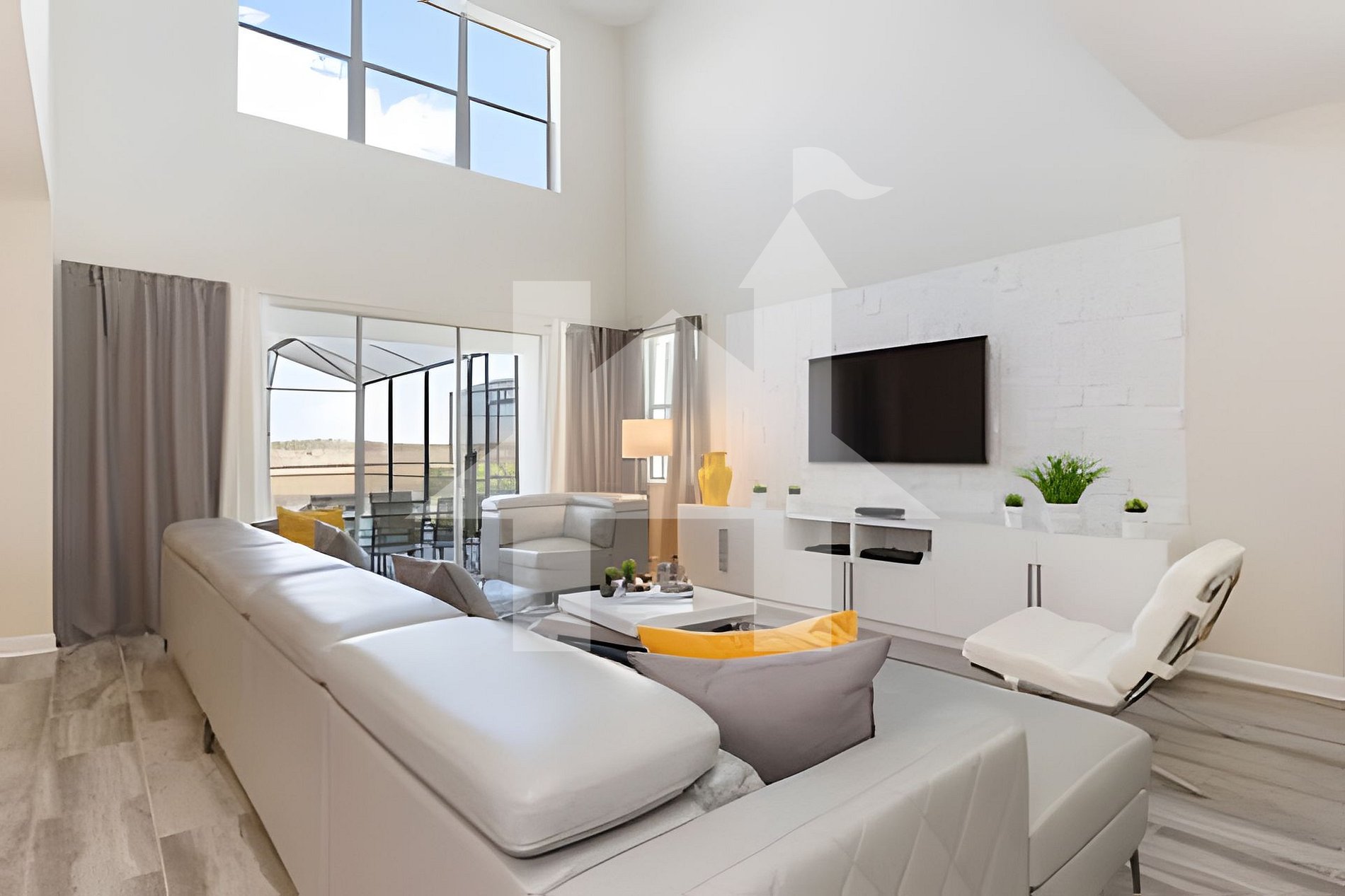 Sala de estar integrada com smart TV e vista para a piscina
