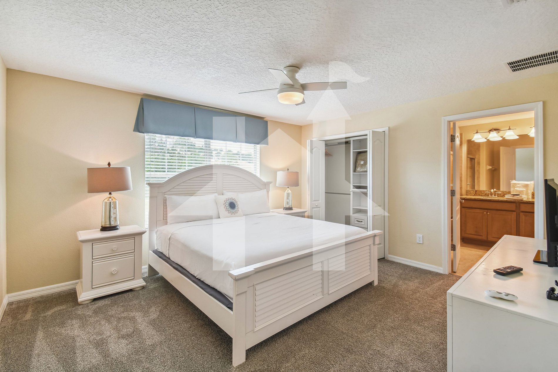 Master Suite (Piso Superior): Suíte principal com cama King, TV, closet e banheiro privativo.