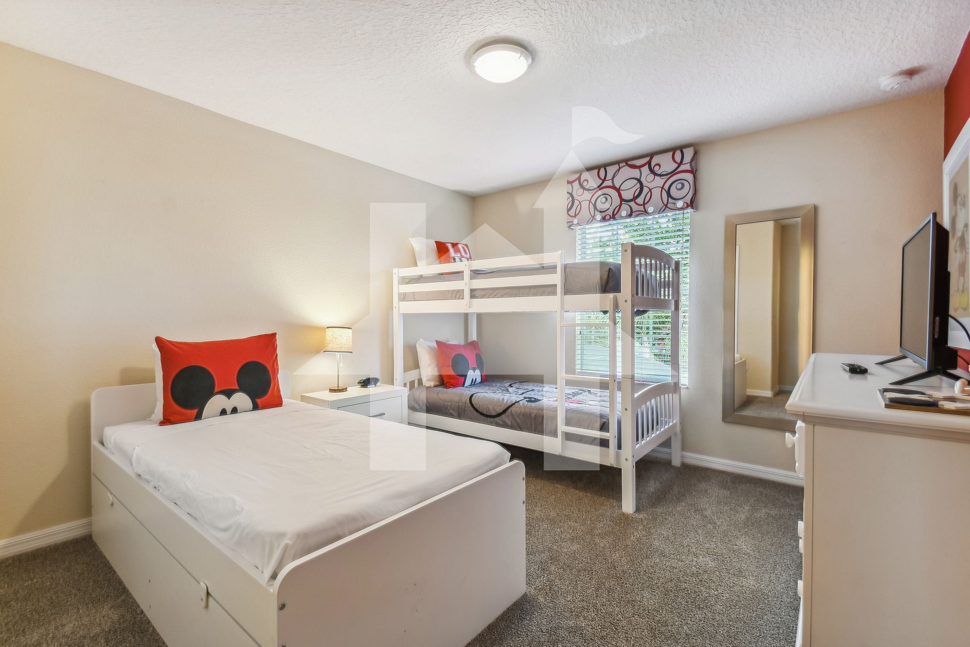 Quarto Mickey (Piso Superior): Ambiente encantador com 1 cama de solteiro e 1 beliche (solteiro sobre solteiro) decorado com tema do Mickey.