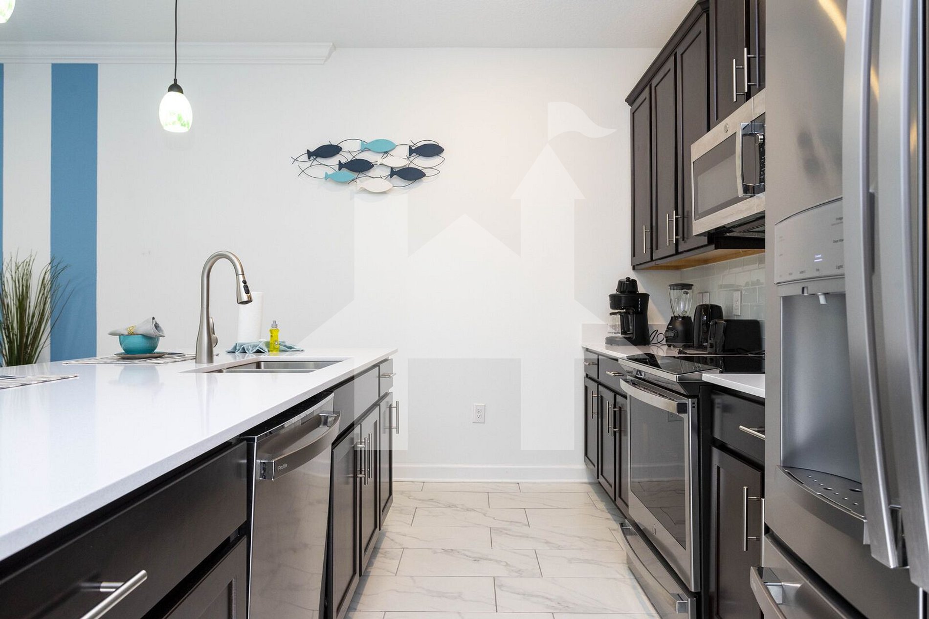 A sala de estar em conceito aberto é perfeita para relaxar após um dia cheio de aventuras, equipada com assentos confortáveis e uma TV de tela grande para noites de cinema. A cozinha moderna, com eletrodomésticos de aço inoxidável e bancadas de granito, oferece tudo o que você precisa para preparar refeições deliciosas. Desfrute das refeições à mesa ou ao ar livre, ao lado da piscina.