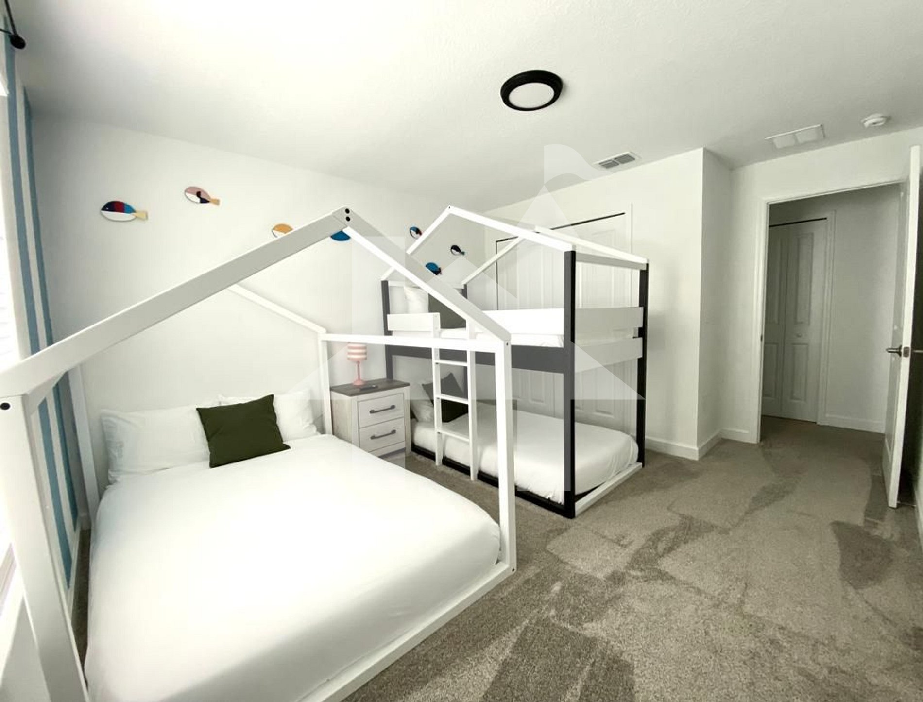 1 quarto temático com cama de casal e beliche twin-over-twin – Perfeito para crianças e adolescentes.