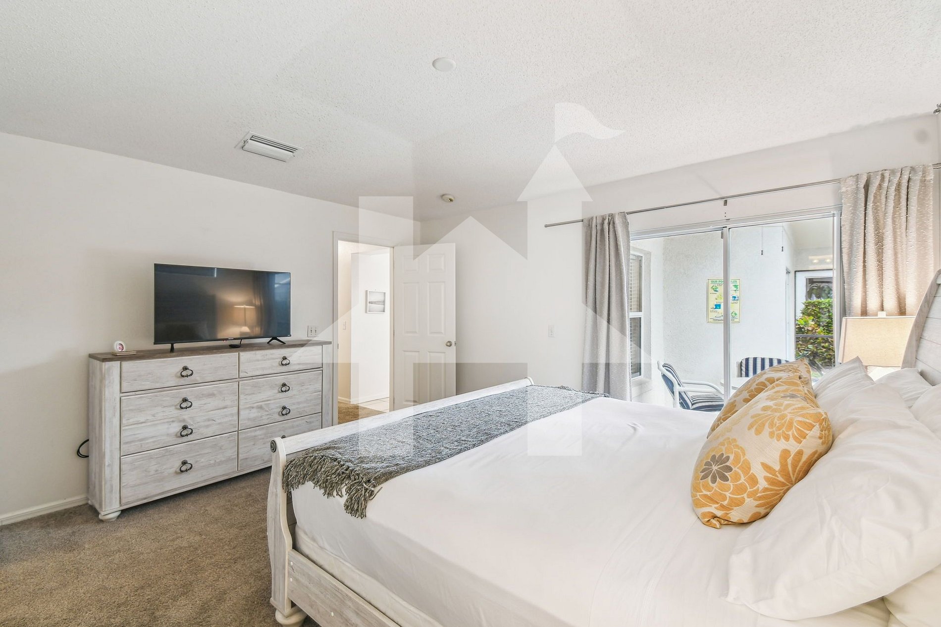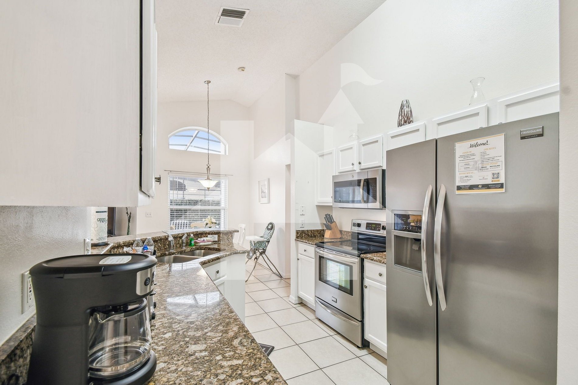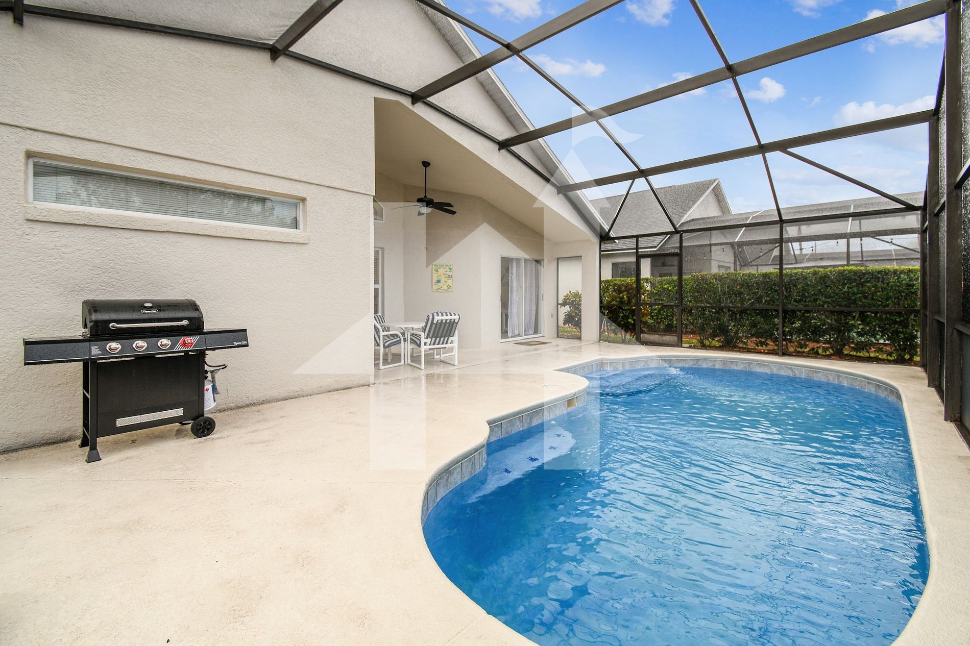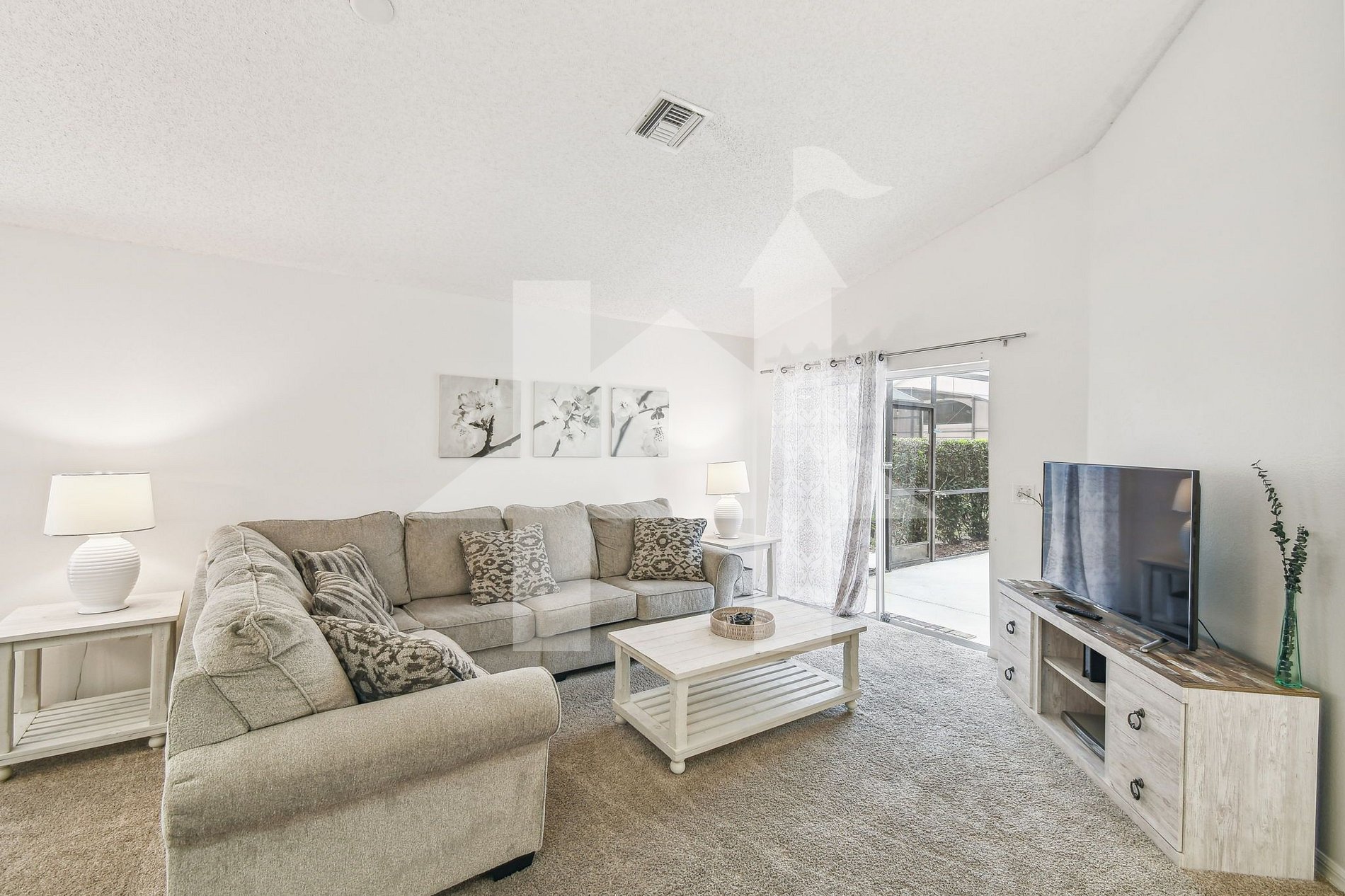Espaços Comuns: A sala de estar conta com um sofá espaçoso para até 8 pessoas e uma TV SMART de 45". A área se conecta ao pátio com lanai coberto, totalmente telado, perfeito para aproveitar a piscina aquecida* e o sol da Flórida.