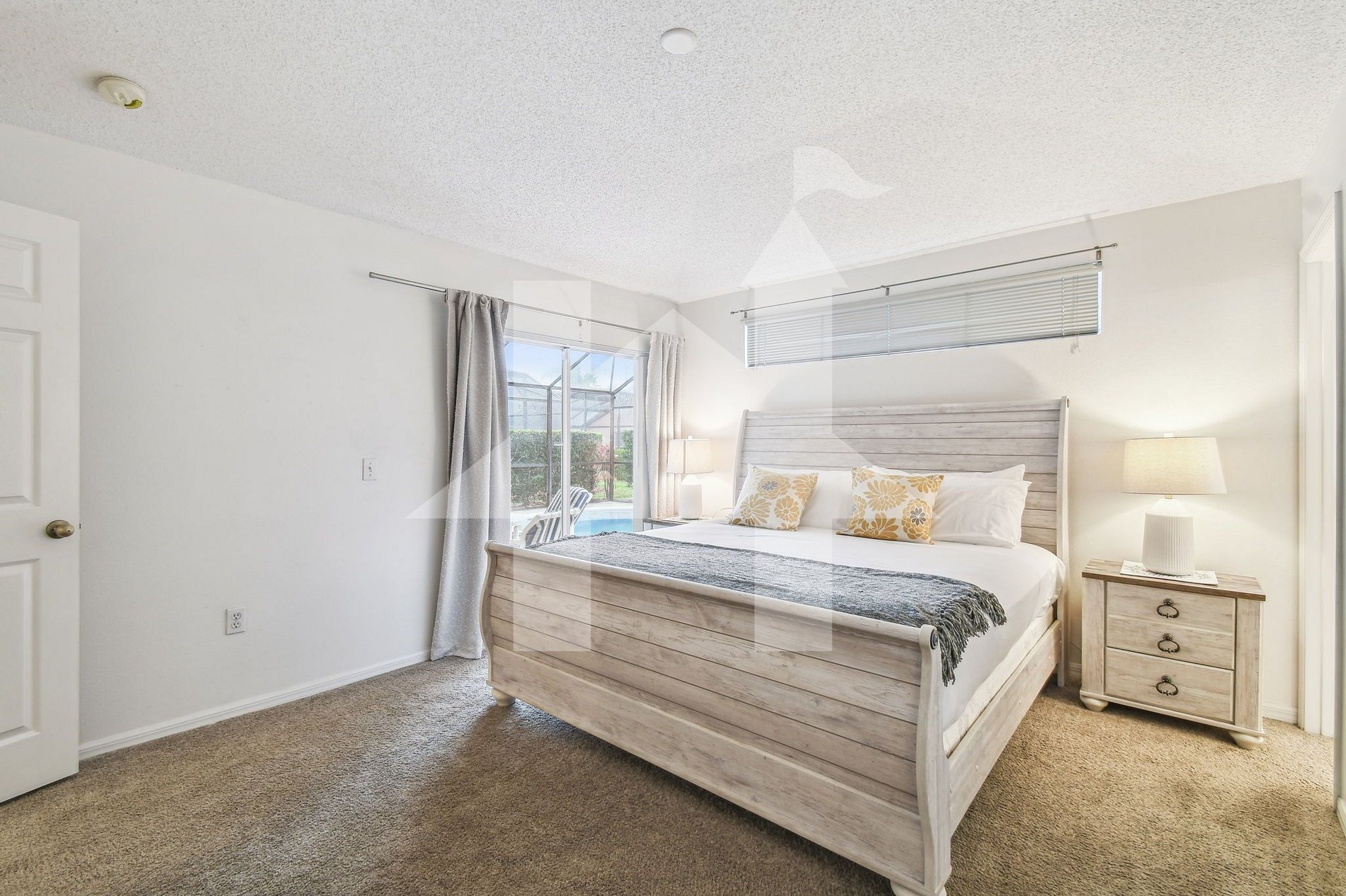 Suíte Master King: Cama king size, SMART TV, closet e banheiro privativo com acesso à área da piscina.