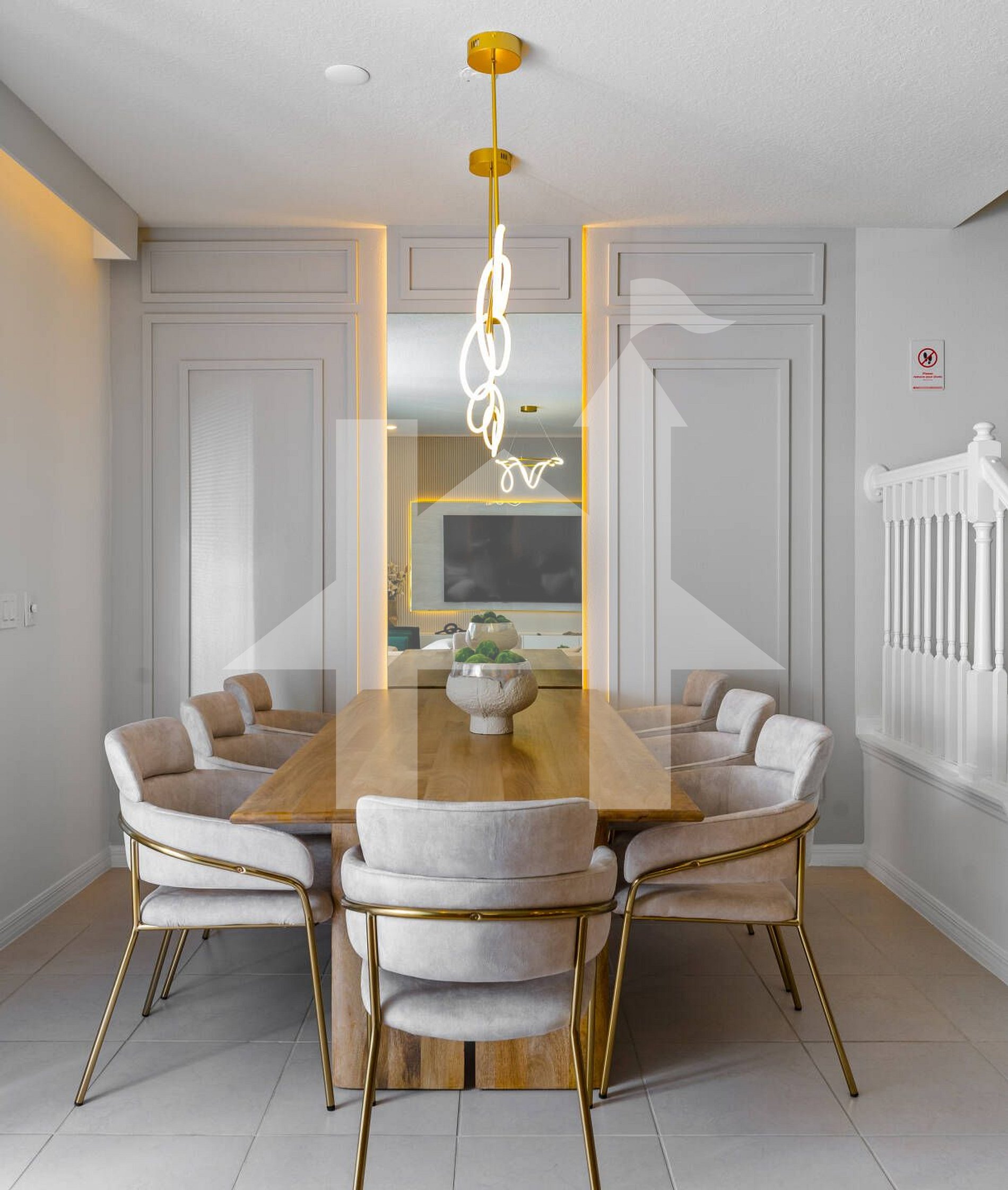 Área de convivência em conceito aberto: cozinha equipada com ilha e 4 bancos, mesa de jantar para 7, sala com sofá chaise e TV Smart 75