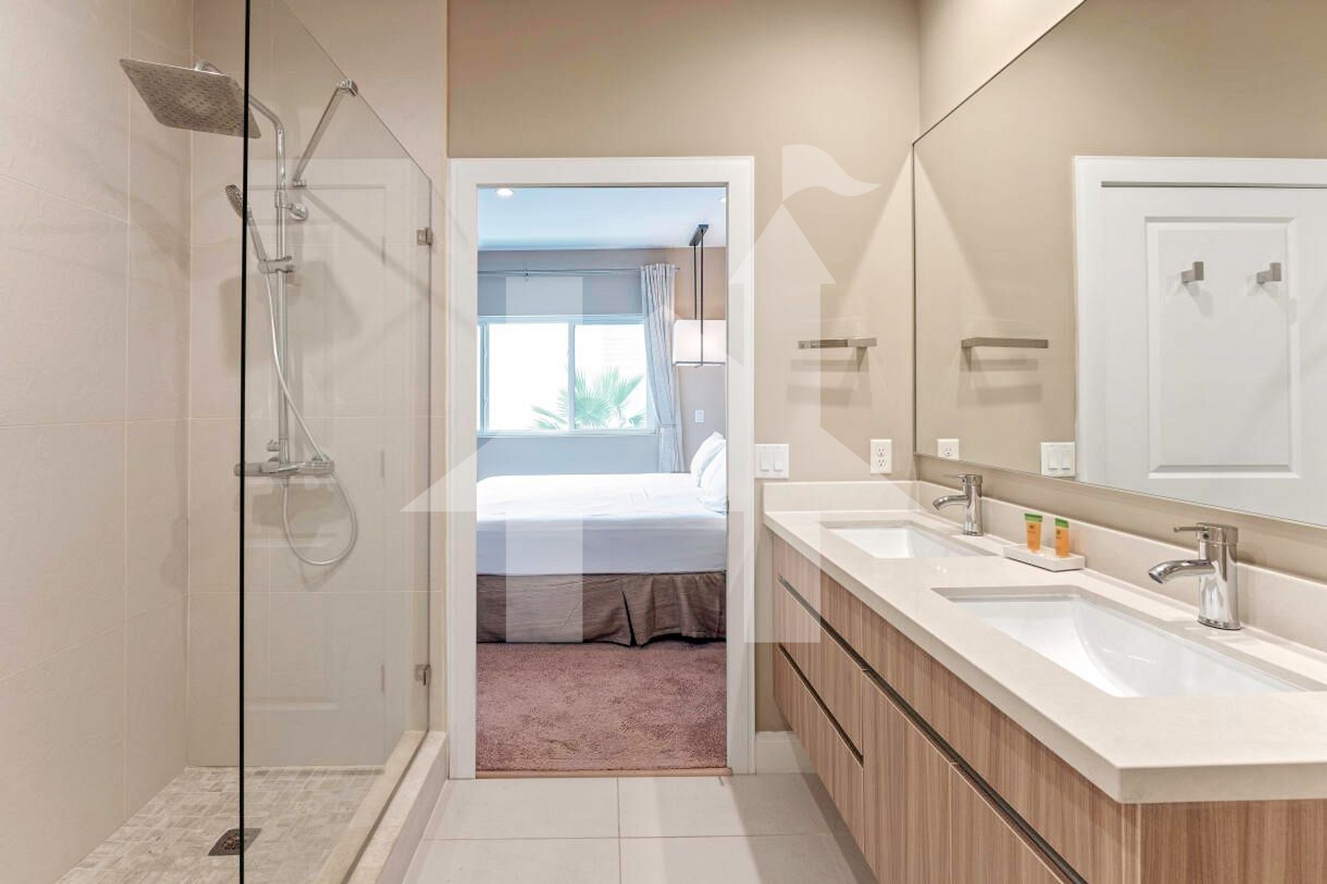 Duas suítes com 2 camas de solteiro cada, banheiros e TVs