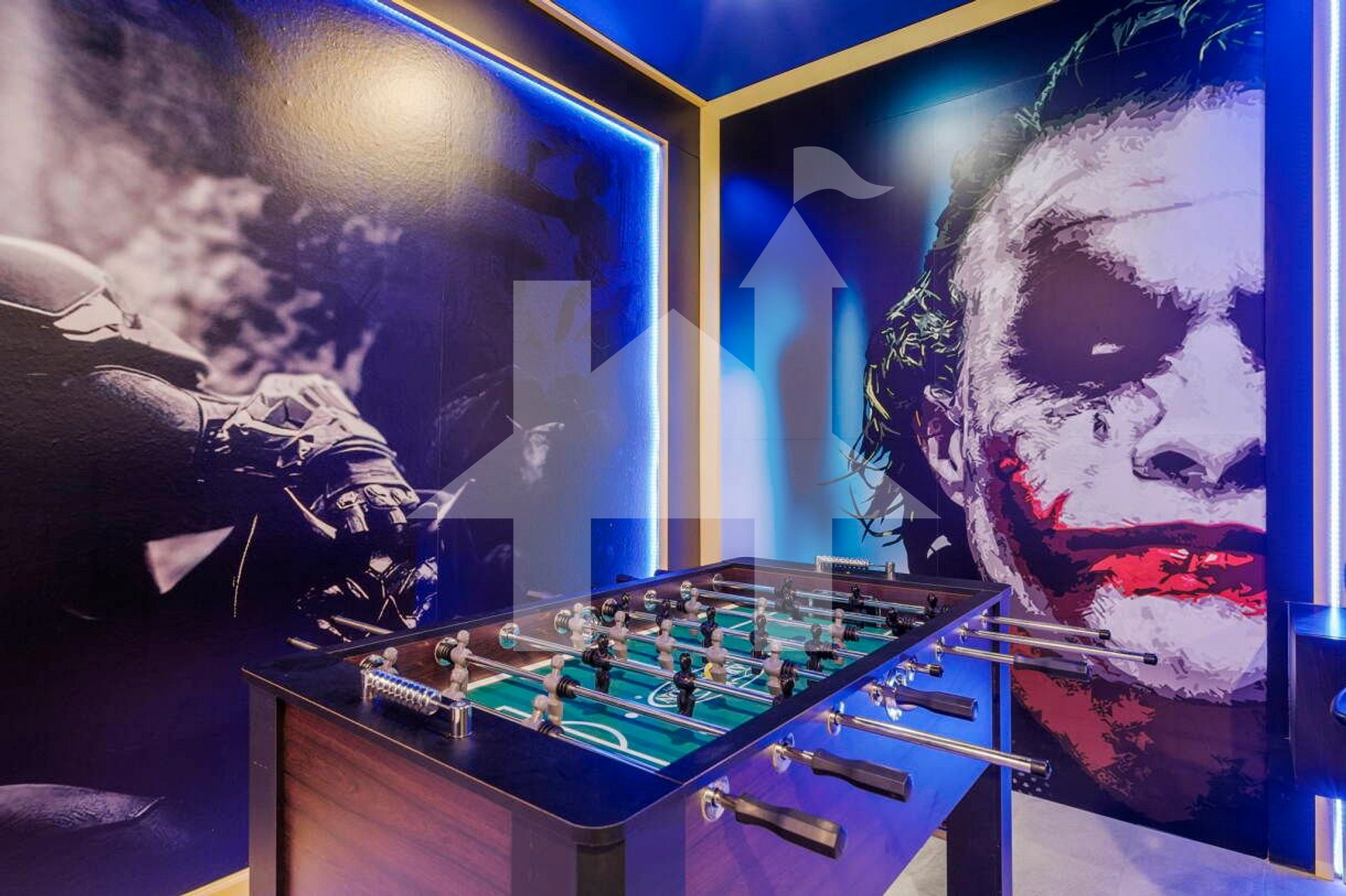 Sala de Jogos (tema Batman) com 2 arcades, playstation, mesa de sinuca, air rock, toto, mesa de bar com TV de 50' e sofá