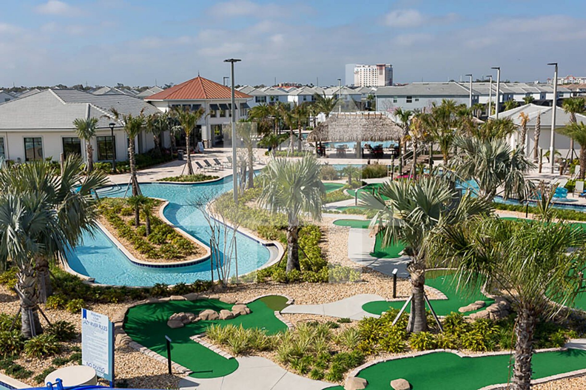 Dois clubes: Cada clube tem um rio lento, uma academia de ginástica e um bar tiki. Os bares tiki servem comidas e bebidas, para que você possa relaxar e aproveitar uma bebida gelada enquanto observa as crianças brincarem no rio lento.