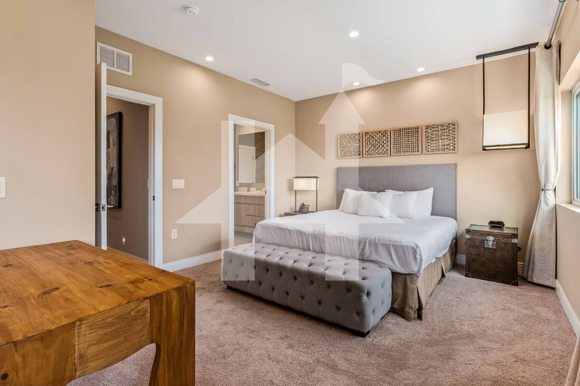Suíte master: cama King, chaise, escrivaninha, Smart TV e closet