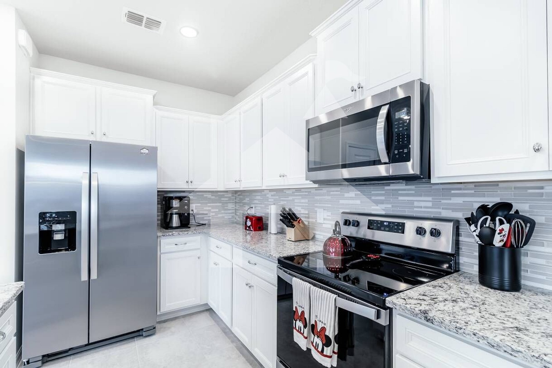 -Cozinha completa com bancada de granito e eletrodomésticos inox