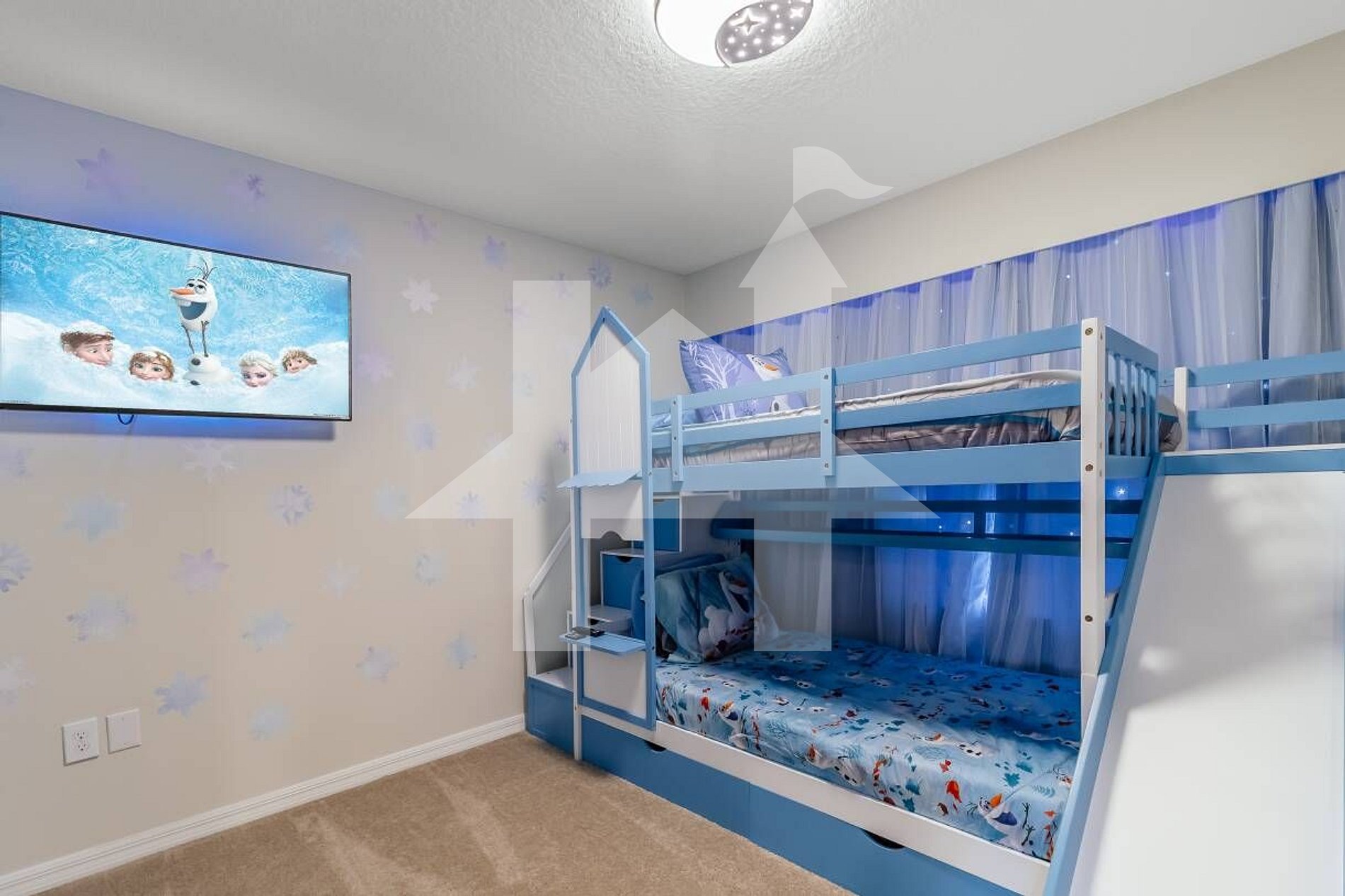 -Quarto Temático Frozen: Beliches de solteiro, TV smart e guarda-roupas.