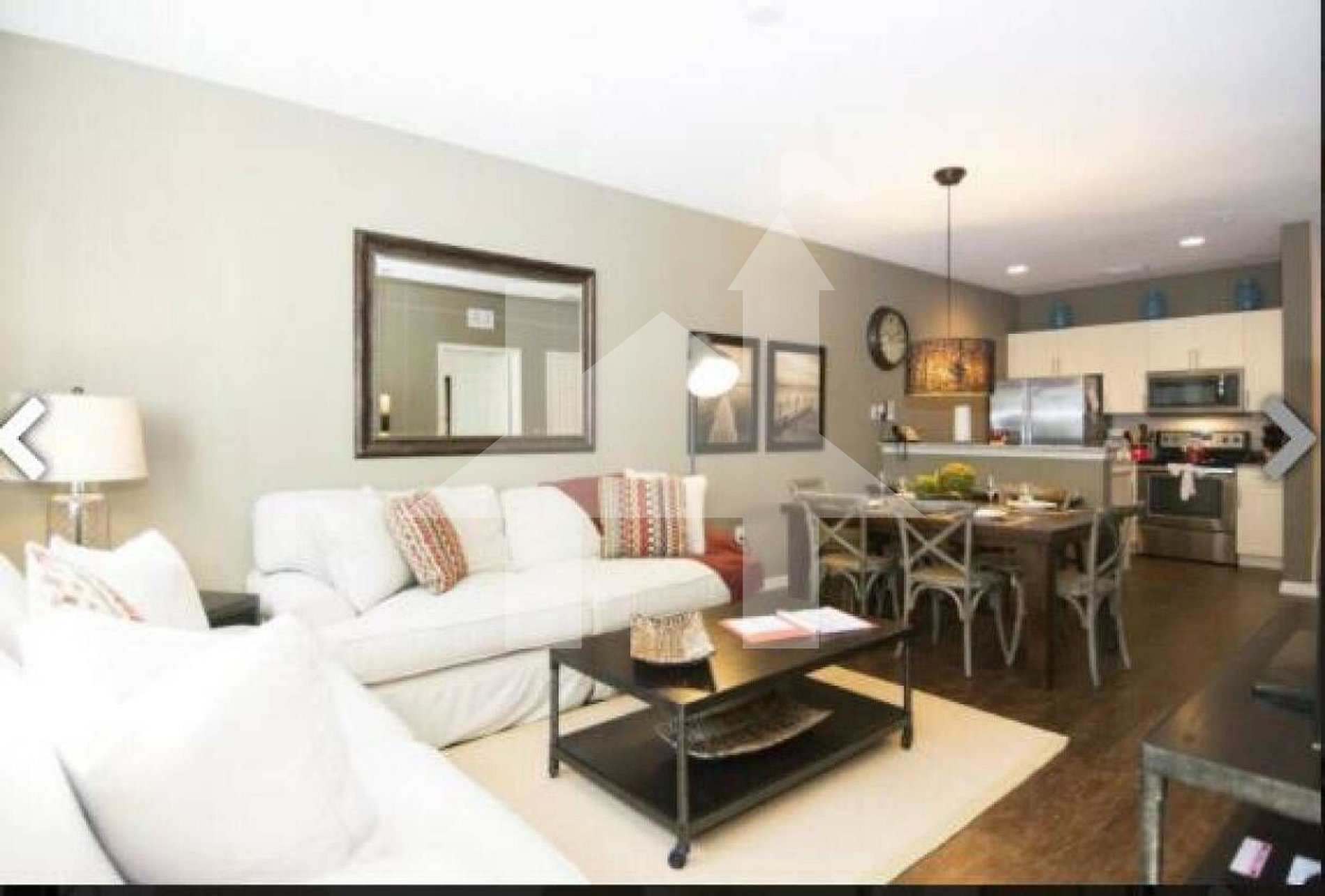 Sala de estar com piso vinílico de alta qualidade, dois sofás e TV de 55″
